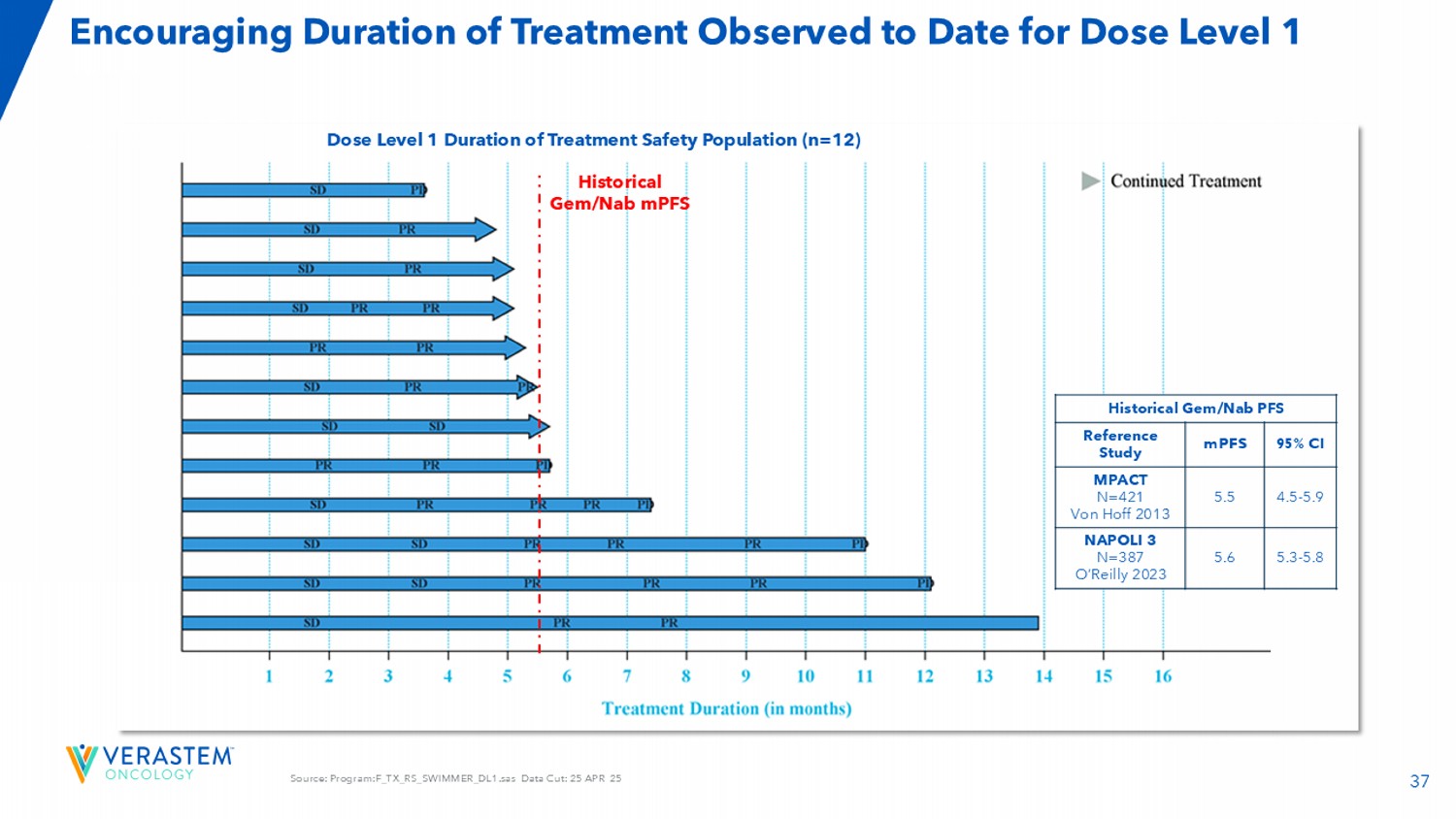37来源:程序:F _ TX _ RS _ SWIMMER _ DL1.SAS数据截取:25日4月25日鼓励治疗持续时间迄今为止观察到的剂量1级剂量1级治疗持续时间安全人群(n = 12)历史GEM/NAB PFS 95% CI MPFS参考研究4.5-5.9 5.5 MPACT N = 421 von hoff 2013年5.3-5.85.6 NAPOLI 3 n = 387 o'reilly 2023年历史GEM/NAB MPFS