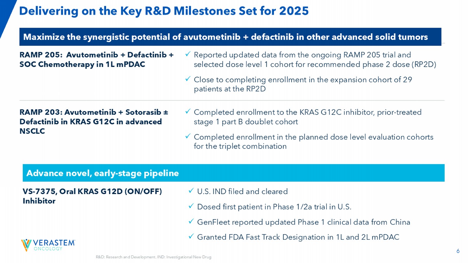 6 x报告了正在进行的RAMP 205试验的更新数据,以及推荐2期剂量(RPTD)的选定剂量1级队列x接近完成RPTD RAMP 205的29名患者扩展队列的入组:阿武托替尼+ Defactinib + SOC化疗1L mPDAC x完成KRAS G12C抑制剂的入组,先前治疗的1期B部分双联队列x完成了三联组合RAMP 203的计划剂量水平评估队列的入组:阿武托替尼+索托拉西±德法替尼在晚期NSCLC的KRAS G12C中实现了设定于2025年的关键研发里程碑,最大限度地发挥阿武托替尼+德法替尼在其他晚期实体瘤中的协同潜力x美国IND在美国的1/2a期试验中申请并批准了x剂量的首例患者x GenFleet报告了来自中国的更新1期临床数据x在1L和2L mPDAC中获得FDA快速通道指定VS-7375,口服KRAS G12D(ON/OFF)抑制剂Advance新型、早期管线研发:研发。IND:研究性新药