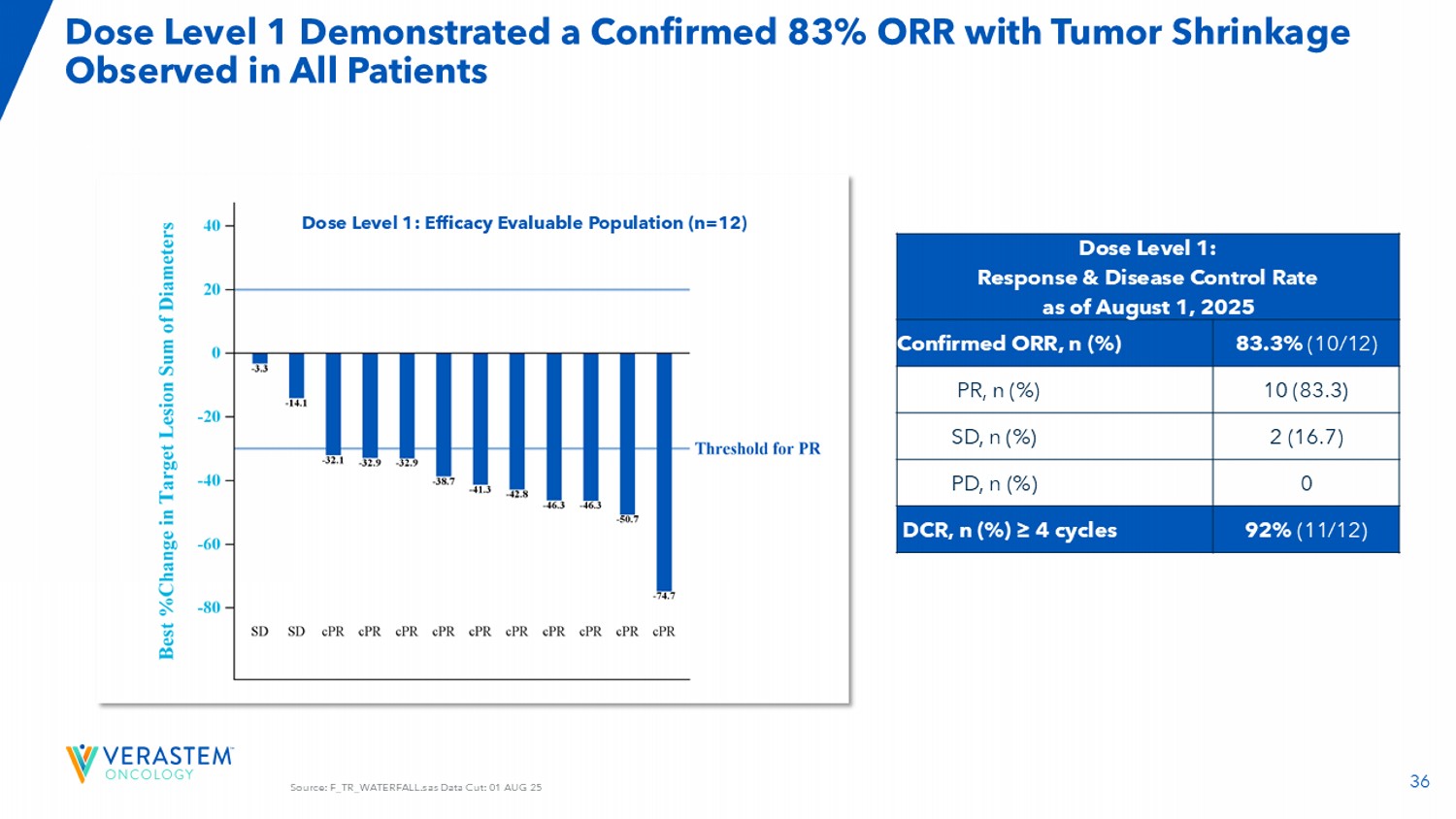 36资料来源:F _ TR _ WATERFALL.SAS数据截取:01 AUG25剂量水平1显示确诊83% ORR,在所有患者中观察到肿瘤缩小剂量水平1:截至2025年8月1日的反应和疾病控制率83.3%(10/12)确诊ORR,n(%)10(83.3)PR,n(%)2(16.7)SD,n(%)0 PD,n(%)92%(11/12)DCR,n(%)≥ 4个周期剂量水平1:疗效可评价人群(n = 12)