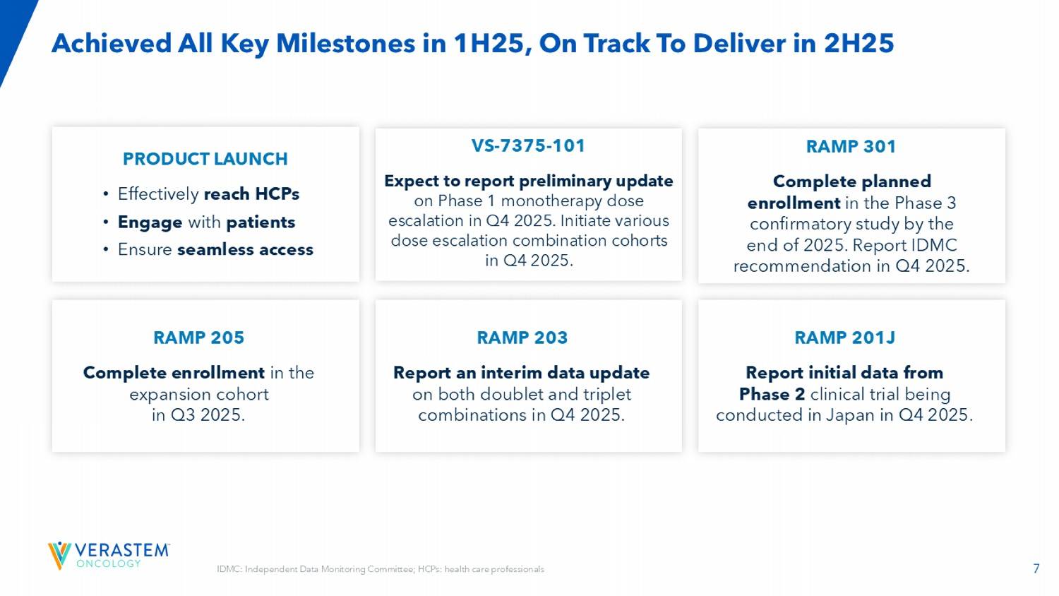 7在1H25实现了所有关键里程碑,有望在2H25交付RAMP 301到2025年底完成3期验证性研究的计划入组。2025年Q4报告IDMC推荐。RAMP 201J报告2025年第四季度在日本进行的2期临床试验的初步数据。RAMP 203报告2025年第四季度双联和三联组合的中期数据更新。RAMP 205将于2025年Q3在扩展队列中完成注册。产品发布•有效到达HCP •与患者接触•确保无缝访问VS-7375-101预计将在2025年第四季度报告1期单药治疗剂量递增的初步更新。在2025年第四季度启动各种剂量递增组合队列。IDMC:独立数据监测委员会;HCPs:医疗保健专业人员