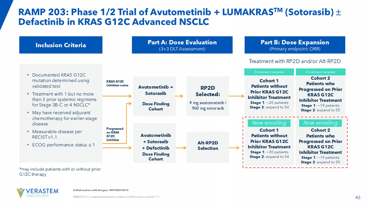 44 RAMP 203:在先前接受过G12C抑制剂三联体联合治疗的患者的第一个三联体联合队列中未观察到剂量限制毒性(DLTs)更新:•截至2024年11月21日,数据截止,三名先前在G12C抑制剂上出现癌症进展的患者接受了sotorasib 960 mg每日连续给药和avutometinib 3.2 mg每周两次(BIW)加defactinib 200 mg每日两次(BID)的三联体联合治疗。阿武托替尼和迪法替尼按四周中的三周给药。• 3名患者中有2名在首次扫描时显示出至少20%的初始肿瘤减少。截至数据截止,这三名患者均仍在接受治疗。• 2025年Q1完成三联组合计划剂量水平评估队列入组。Doublet组合更新:•如先前报道,avutometinib与sotorasib的doublet组合已完成G12C抑制剂治疗-NA ï ve Stage 1 Part B队列的入组(n = 28)。•于2025年第1季度完成KRAS G12C抑制剂、先前治疗的第1阶段B部分双联队列的入组。•继续跟踪纳入双联队列的患者,以获得安全性和有效性结果(既有先前治疗的队列,也有未接受治疗的队列)。