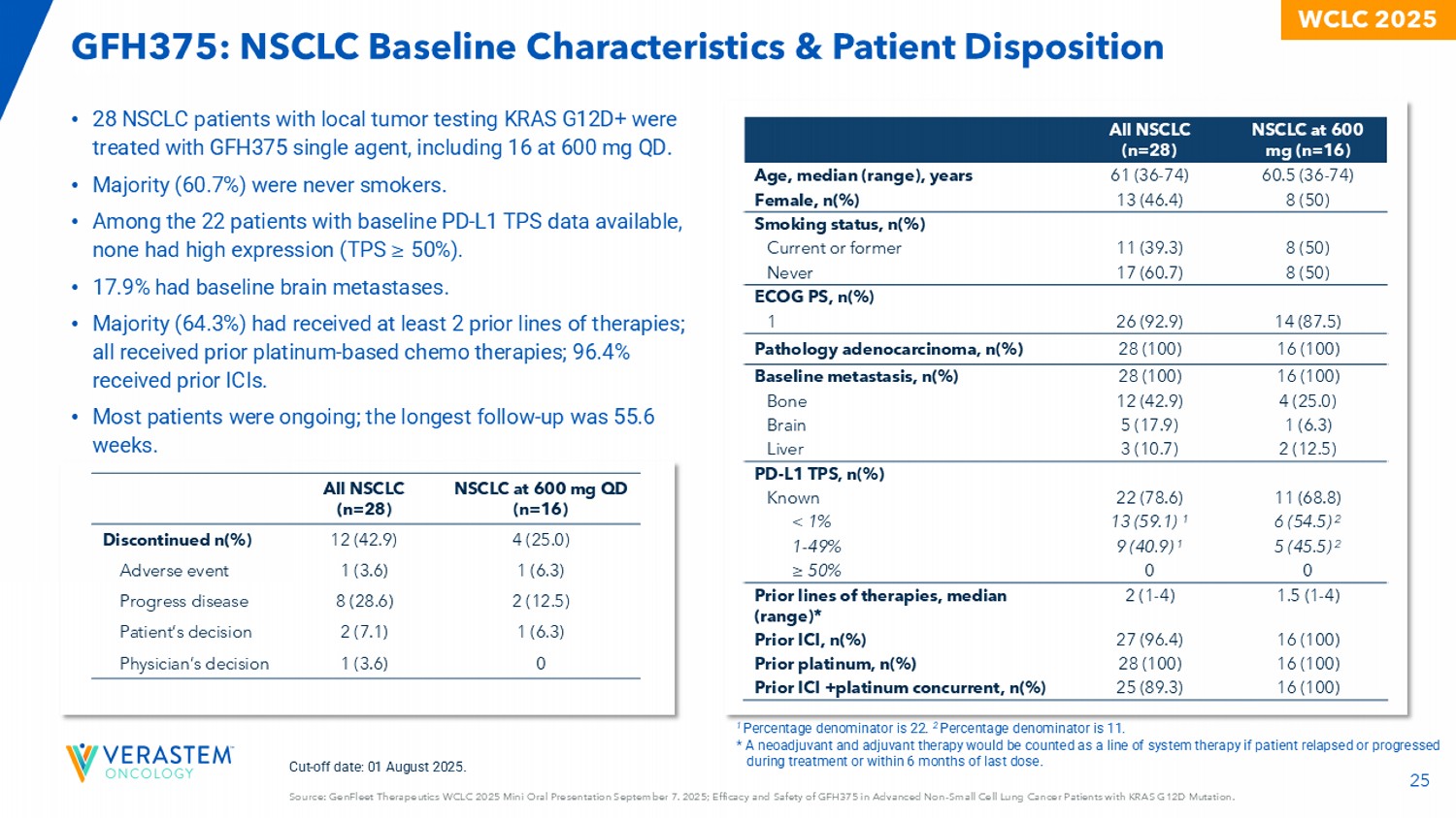 27 WCLC 2025 GFH375:所有患者的安全性来源:GenFleet Therapeutics WCLC 2025迷你口头报告9月7日。2025;GFH375在KRAS G12D突变的晚期N对小细胞肺癌患者中的疗效和安全性。•采用GFH375单药治疗晚期KRAS G12D突变的142例NSCLC患者,其中28例。» 93%的基线ECOG PS = 1。» 75%的人至少接受过≥ 2个既往线的治疗。• 97例患者,其中NSCLC 16例,接受600mg QD治疗。•无治疗相关死亡。• 4.2%的患者因TRAE停止治疗。• 27.5%的患者有3/4级TRAE。•总体而言,GFH375在既往接受过治疗的晚期癌症患者中具有可控的安全性。• ≥ 3级TRAE和SAE在NSCLC患者中更常见;然而,停药率似乎相似。600mg QD所有剂量水平的不良事件,n(%)NSCLC(N = 16)所有类型(N = 97)NSCLC 2(N = 28)所有类型1(N = 142)TEAEs 16(100)96(99.0)28(100)141(99.3)所有等级7(43.8)41(42.3)15(53.6)60(42.3)等级≥ 33(18.8)19(19.6)6(21.4)27(19.0)SAE 4(25.0)31(32.0)10(35.7)51(35.9)导致中断3(18.8)7(7.2)5(17.9)12(8.5)导致减少1(6.3)6(6.2)1(3.6)9(6.3)导致停药03(3.1)04(2.8)导致死亡TRAEs 16(100)96(99.0)28(37.5)25(25.8)13(46.4)39(27.5)级≥ 32(12.5)8(8.2)4(14.3)11(7.7)SAE 3(18.8)19(19.6)9(32.1)33(23.2)导致中断3(18.8)7(7.2)5(17.9)11(7.7)导致减少1(6.3)4(4.1)1(3.6)6(4.2)导致停药0000导致死亡数据c截止日期:2025年6月17日截止日期,所有患者对GFH375的中位暴露时间为9.6(范围:0.9-49.1)周。1包括在所有剂量水平下接受治疗的所有患者:100mg QD(n = 1),200mg QD(n = 1),400mg QD(n = 29),600mg QD(n = 97),750m g QD(n = 8),900mg QD(n = 3),300mg BID(n = 3)。2包括所有剂量水平治疗的NSCLC患者:100mg QD(n = 1)、200mg QD(n = 1)、400mg QD(n = 7)、600mg QD(n = 16)、750mg QD(n = 1)、300mg BID(n = 2)。SAE,严重不良事件;TEAEE,治疗紧急不良事件;TRAE,治疗相关不良事件。