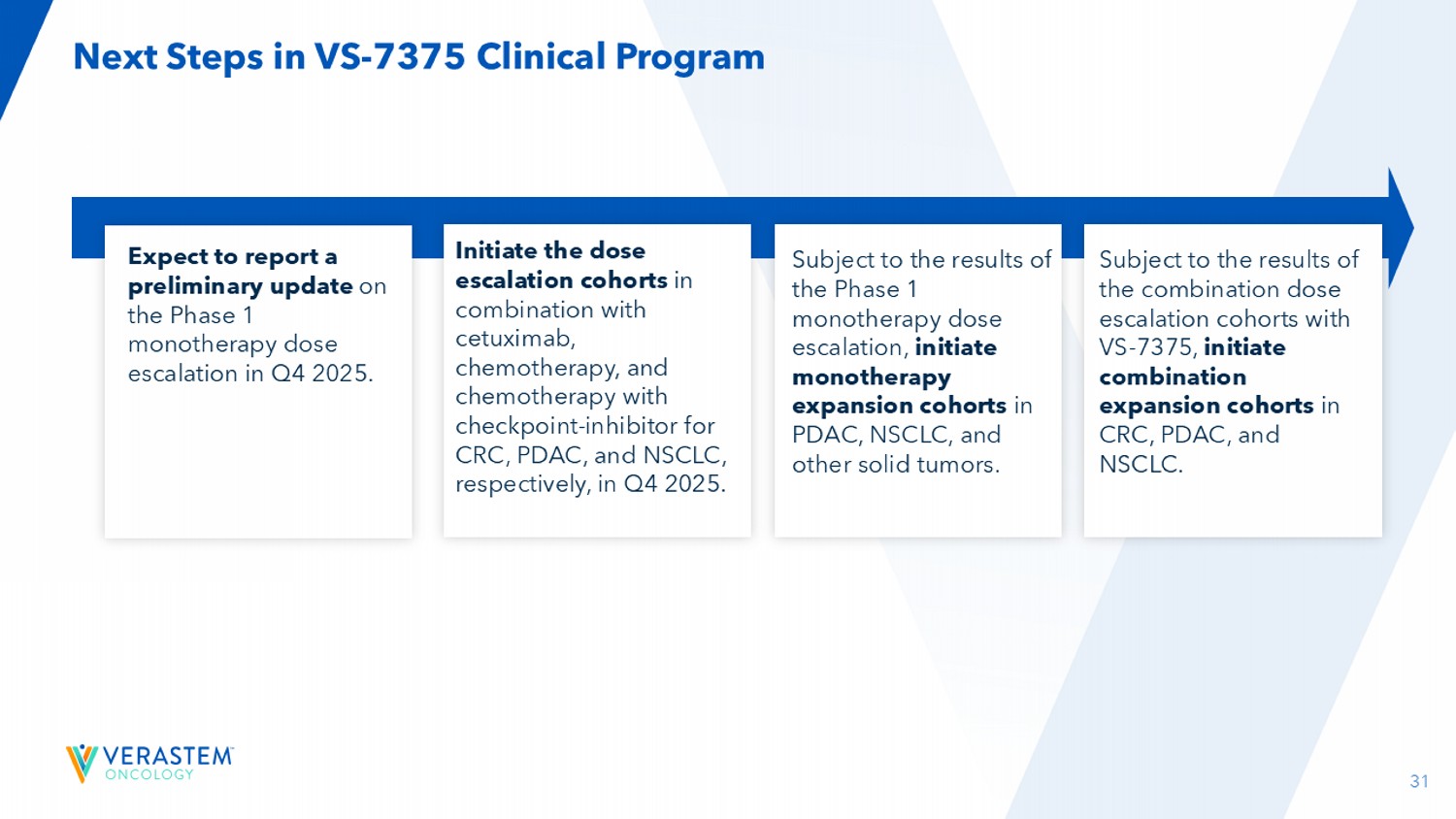 31 VS的下一步-7375临床计划预计将在2025年第四季度报告1期单药治疗剂量递增的初步更新。以1期单药治疗剂量递增结果为准,在PDAC、NSCLC和其他实体瘤中启动单药治疗扩展队列。分别于2025年Q4启动与西妥昔单抗、化疗、化疗联合检查点抑制剂治疗CRC、PDAC、NSCLC的剂量递增队列。以VS-7375的联合剂量递增队列结果为准,在CRC、PDAC和NSCLC中启动联合扩大队列。
