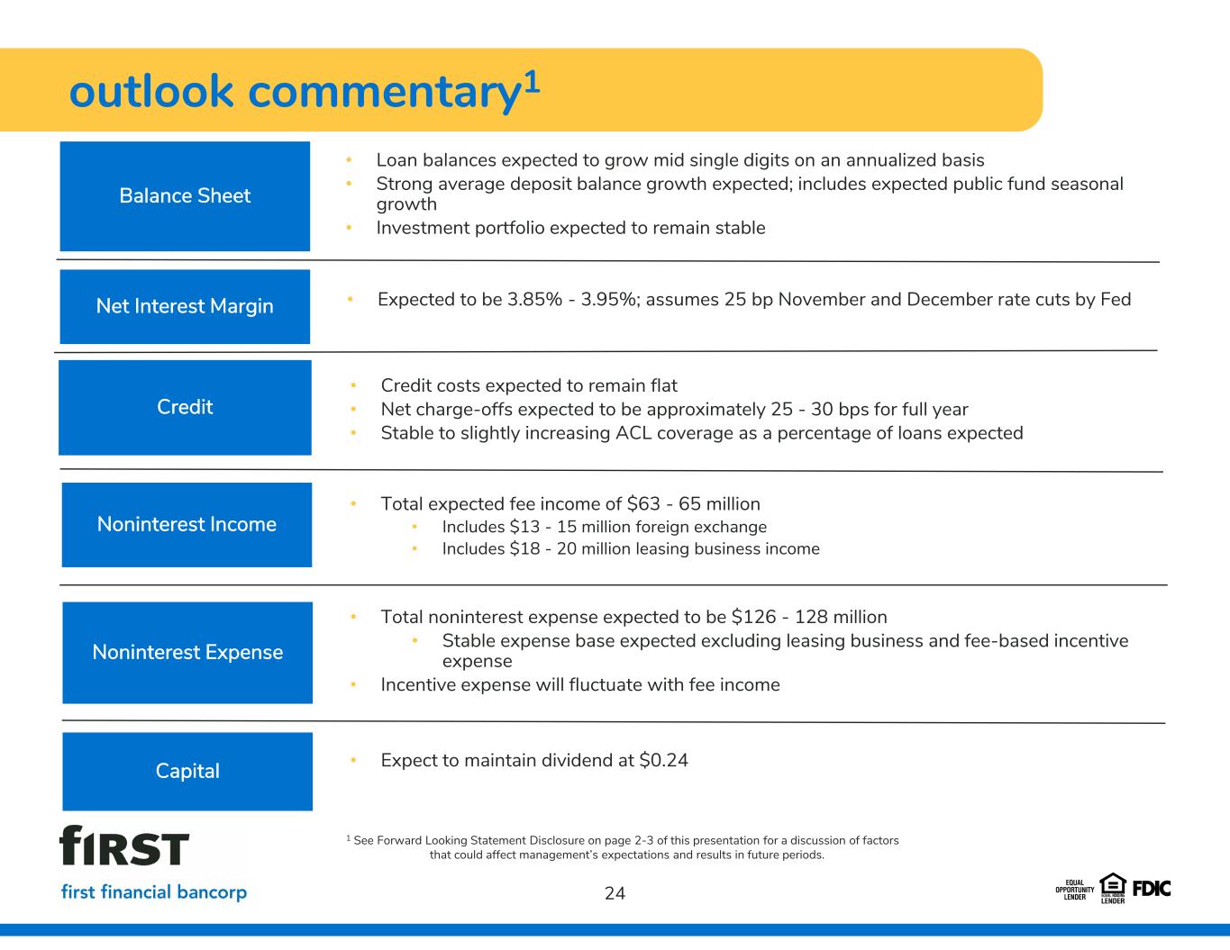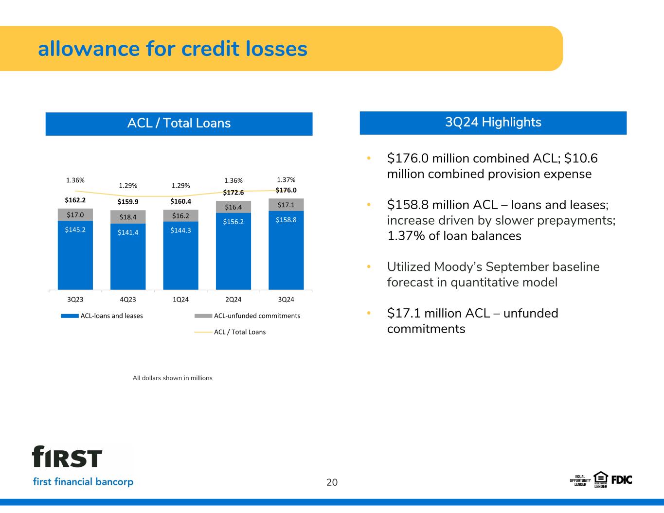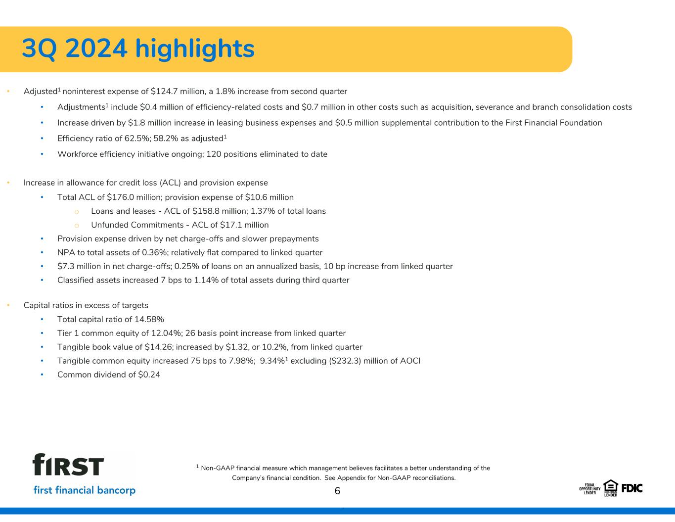 2024年第三季度亮点•调整后1非利息支出为1.247亿美元,较第二季度增长1.8% •调整1包括40万美元的效率相关成本和70万美元的收购等其他成本,遣散费和分支机构合并费用•增加的原因是租赁业务费用增加了180万美元,以及对第一财务基金会的补充捐款增加了50万美元•效率为62.5%;调整后为58.2% 1 •员工效率举措正在进行中;迄今已裁撤120个职位•信用损失准备金(ACL)和拨备费用增加• ACL总额1.760亿美元;拨备费用1060万美元o贷款和租赁-ACL 1.588亿美元;占贷款总额的1.37% o无资金承诺-ACL 1710万美元•由净冲销推动的拨备费用以及较慢的预付款• NPA与总资产之比为0.36%;与上一季度相比相对持平•净冲销730万美元;贷款按年化计算为0.25%,较上一季度增加10个基点•第三季度期间分类资产占总资产的比例增加7个基点至1.14% •资本比率超过目标•总资本比率为14.58% •一级普通股权益为12.04%;较上一季度增加26个基点•有形账面价值为14.26美元;增加1.32美元,或10.2%,从环比看•有形普通股权益增长75个基点至7.98%;9.34% 1不包括(2.323亿美元)的AOCI •共同股息0.2461美元非公认会计准则财务指标,管理层认为这有助于更好地了解公司的财务状况。非GAAP对账见附录。。