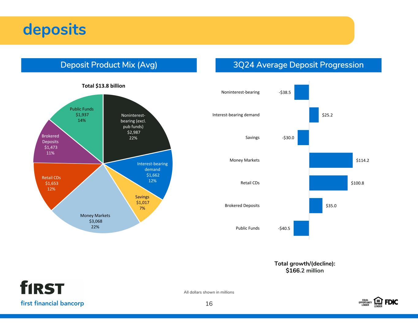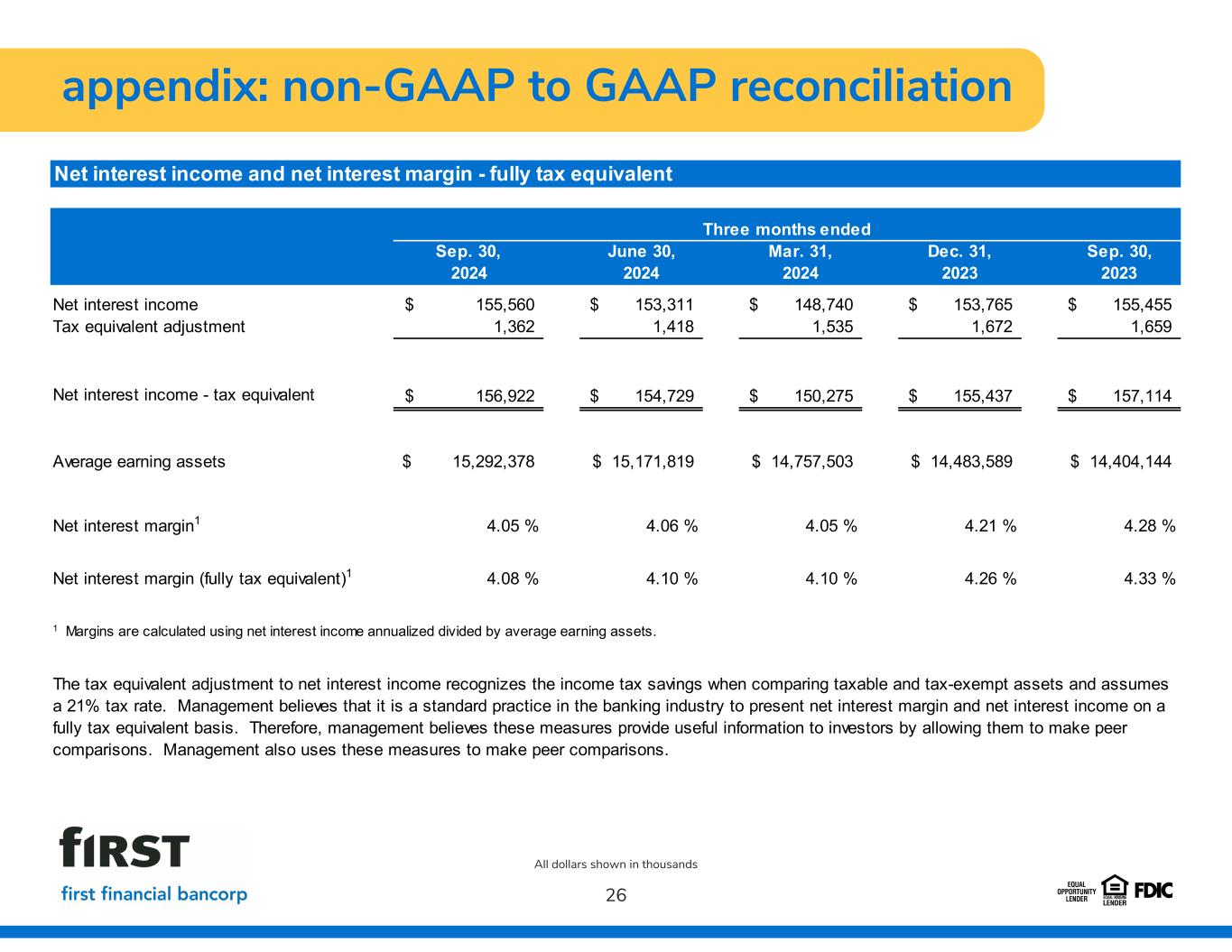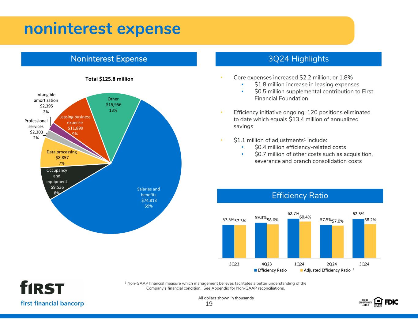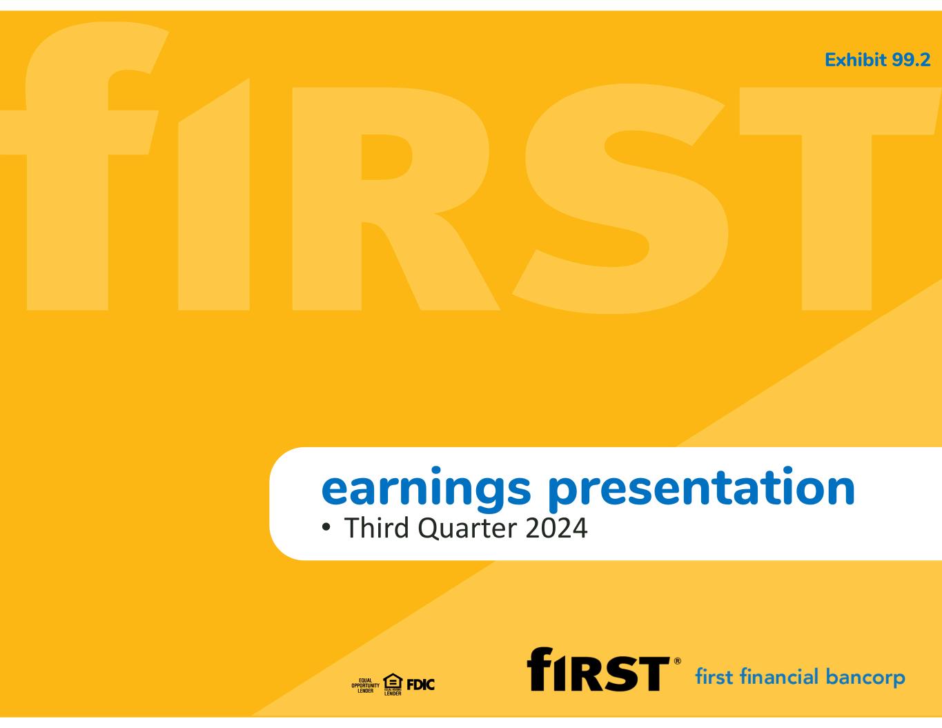 2024年第三季度亮点•调整后1非利息支出为1.247亿美元,较第二季度增长1.8% •调整1包括40万美元的效率相关成本和70万美元的收购等其他成本,遣散费和分支机构合并费用•增加的原因是租赁业务费用增加了180万美元,以及对第一财务基金会的补充捐款增加了50万美元•效率为62.5%;调整后为58.2% 1 •员工效率举措正在进行中;迄今已裁撤120个职位•信用损失准备金(ACL)和拨备费用增加• ACL总额1.760亿美元;拨备费用1060万美元o贷款和租赁-ACL 1.588亿美元;占贷款总额的1.37% o无资金承诺-ACL 1710万美元•由净冲销推动的拨备费用以及较慢的预付款• NPA与总资产之比为0.36%;与上一季度相比相对持平•净冲销730万美元;贷款按年化计算为0.25%,较上一季度增加10个基点•第三季度期间分类资产占总资产的比例增加7个基点至1.14% •资本比率超过目标•总资本比率为14.58% •一级普通股权益为12.04%;较上一季度增加26个基点•有形账面价值为14.26美元;增加1.32美元,或10.2%,从环比看•有形普通股权益增长75个基点至7.98%;9.34% 1不包括(2.323亿美元)的AOCI •共同股息0.2461美元非公认会计准则财务指标,管理层认为这有助于更好地了解公司的财务状况。非GAAP对账见附录。。
