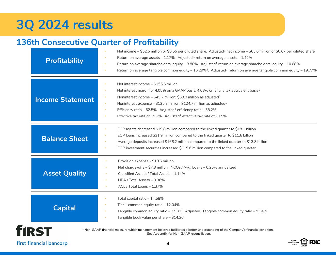 前瞻性陈述披露3 •金融服务改革和其他可能对我们的收入和业务产生负面影响的当前、未决或未来立法或法规,包括《多德-弗兰克法案》和其他与银行产品和服务有关的立法和法规;•当前利率环境或利率或我们的资产或负债水平或构成的变化对我们的净利息收入、净息差和我们的抵押贷款来源的影响,抵押服务权和为出售而持有的抵押贷款;•股票市场价格下跌对我们的经纪、资产和财富管理业务的影响;•我们的运营或安全系统或基础设施或我们的第三方供应商或其他服务提供商的系统或基础设施出现故障或遭到破坏,包括由于网络攻击;•支票或储蓄账户存款水平的变化对我们的融资成本和净息差的影响;•我们制定和执行有效的业务计划和战略的能力。可能导致我们的实际结果与我们的前瞻性陈述中描述的结果存在重大差异的其他因素,请参见我们截至2023年12月31日止年度的10-K表格,以及我们向SEC提交的其他文件,这些文件可在SEC网站www.sec.gov上查阅。本文件中包含的所有前瞻性陈述均在本文件发布之日作出,并基于提交文件时可获得的信息。除法律要求外,公司不承担更新任何前瞻性陈述的任何义务。
