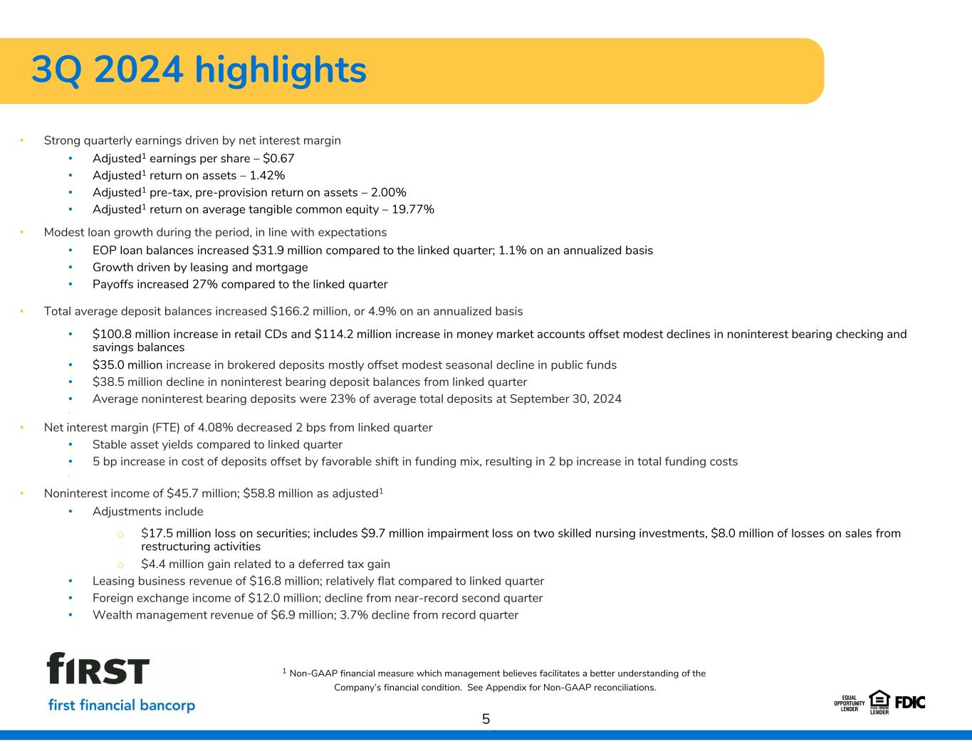 2024年第三季度亮点•净息差推动的强劲季度收益•调整后1每股收益– 0.67美元•调整后1资产回报率– 1.42% •调整后1税前、拨备前资产回报率– 2.00% •调整后1平均有形普通股权益回报率– 19.77% •期内贷款增长温和,符合预期• EOP贷款余额与上一季度相比增加3190万美元;年化1.1% •租赁和抵押贷款推动的增长•与上一季度相比,支付增加27% •总平均存款余额增加1.662亿美元,或年化4.9% •零售CD增加1.008亿美元,货币市场账户增加1.142亿美元,抵消了无息支票和储蓄余额的小幅下降•经纪存款增加3500万美元,大部分抵消了公共基金的季节性小幅下降•与关联季度相比,无息存款余额减少3850万美元•截至9月30日,平均无息存款为平均总存款的23%,2024年••净息差(FTE)为4.08%,较上一季度下降2个基点•与上一季度相比资产收益率稳定•存款成本增加5个基点被资金组合的有利转变所抵消,导致总资金成本增加2个基点••非利息收入4570万美元;调整后5880万美元1 •调整包括证券损失1750万美元;包括两项熟练护理投资的970万美元减值损失,重组活动产生的销售损失800万美元o与递延税项收益相关的440万美元收益•租赁业务收入1680万美元;与关联季度相比相对持平•外汇收入1200万美元;与接近创纪录的第二季度相比有所下降•财富管理收入690万美元;与创纪录的第五季度相比下降3.7% 1管理层认为,这有助于更好地了解公司的财务状况。非GAAP调节见附录。。