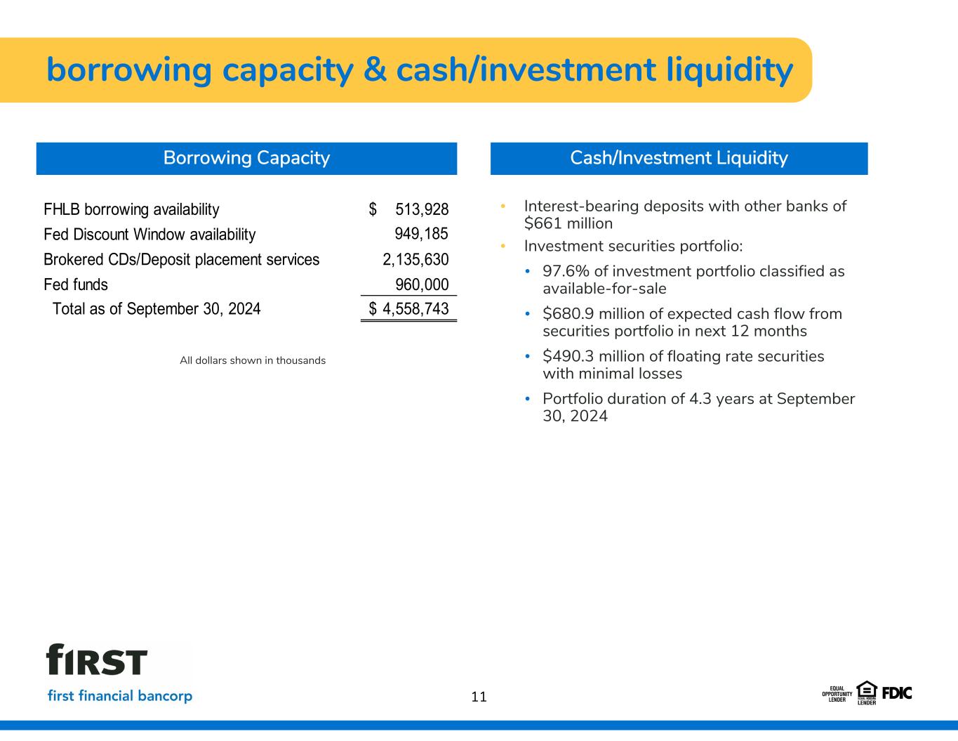 11借款能力•在其他银行的有息存款6.61亿美元•投资证券组合:• 97.6%的投资组合归类为可供出售•未来12个月证券组合的预期现金流6.809亿美元• 4.903亿美元的浮动利率证券,损失最小•截至2024年9月30日的投资组合期限为4.3年借款能力&现金/投资流动性现金/投资流动性以千FHLB借款可用性显示的所有美元513,928 $美联储贴现窗口可用性949,185经纪CD/存款配售服务2,135,630联邦基金960,000截至2024年9月30日总计4,558,743 $