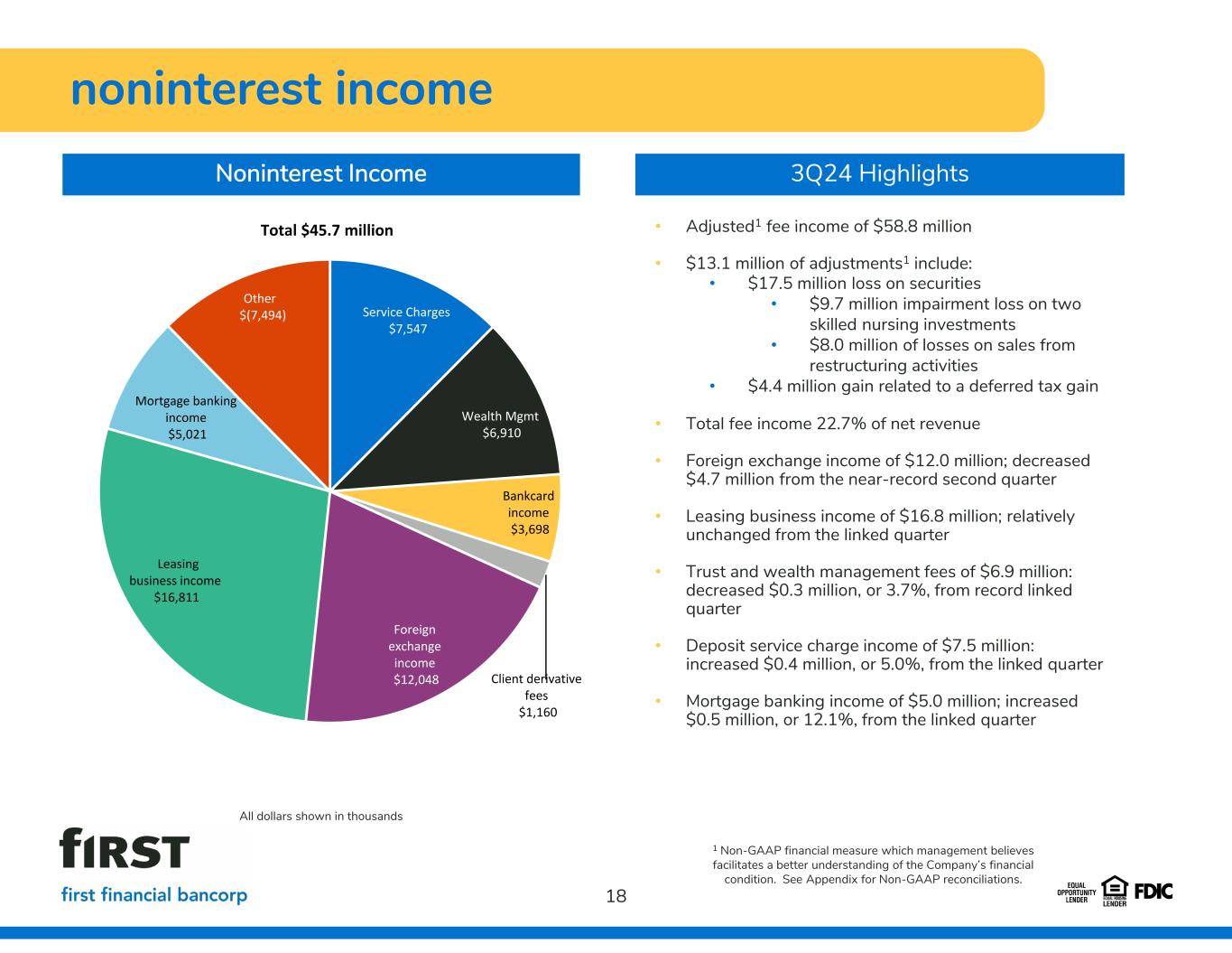 调整后的净收入17下表列出了公司认为对理解其季度业绩具有重要意义的某些调整。1非公认会计准则财务指标,管理层认为这有助于更好地了解公司的财务状况。有关非GAAP调节,请参见附录。所有美元都以千为单位显示,除报告调整后的每股金额1报告调整后1净利息收入155,560美元155,560美元153,311美元153,311美元信用损失准备金-贷款和租赁9,930美元9,930美元16,157美元16,157美元信用损失-无准备金承诺694美元694美元286美元286美元非利息收入45,701美元45,701美元61,501美元减:证券交易收益(损失)-(17,468)A-(64)A减:递延税项调整-4,353 A--A非利息收入总额45,701美元58,816美元61,501美元61,565美元非利息费用125,759美元125,759美元123,574美元123,574美元减:FDIC特别评估---A-(70)A减:效率相关成本-383 A-368 A减:其他-695 A-818 A非利息费用总额125,759美元124,681美元123,574美元122,458美元收入所得税前64,878美元79,071美元74,795美元75,975美元所得税费用12,427美元12,427美元13,990美元13,990美元加:税收抵免投资的税后影响@21%-24-10加:调整的税收影响(a)@21%法定税率-2,981-263所得税费用总额12,427美元15,432美元13,990美元14,262美元净收入52,451美元63,639美元60,805美元61,713美元每股净收益-稀释0.55美元0.67美元0.64美元0.65美元税前,拨备前平均资产回报率1.68% 2.00% 2.07% 2.10% 2024年第三季度2024年第二季度