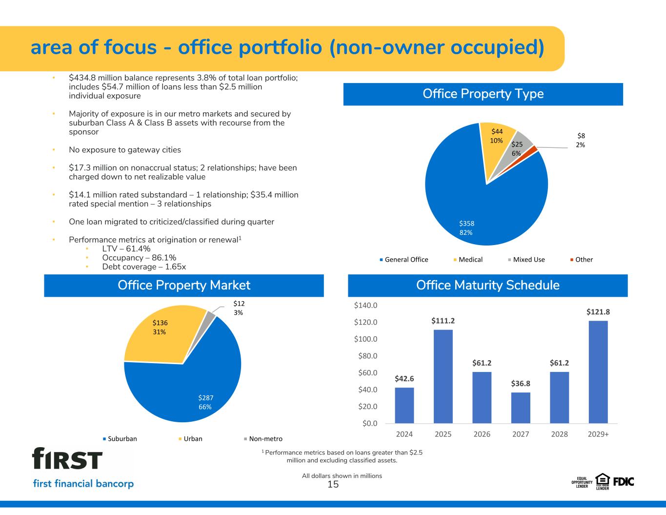 贷款集中度14按部门划分的C & I和业主占用的CRE贷款1按物业类型划分的投资者CRE贷款所有美元以百万计1不包括雅居乐优质金融物业类型9/30/24%总贷款住宅多户家庭5 + $ 1,279.21 1.1%零售物业790.06.8%办公434.8 3.8%工业399.4 3.5%医院/疗养院298.0 2.6%酒店187.1%土地111.4 1.0%住宅1-4家庭105.8 0.9%工业54.8 0.5%其他房地产51.6 0.4%自存储12.6 0.1%其他0.10.0%总计$ 3,725.03 2.2% NAICS部门9/30/24%总贷款金融和保险$ 1,236.2 10.7%制造业493.14.3%住宿和食品服务308.0 2.7%建筑业280.7 2.4%医疗保健和社会救助275.4 2.4%房地产和租赁和租赁260.8 2.3%专业、科学、技术服务258.5 2.2%零售贸易242.3 2.1%批发贸易202.8 1.8%农林渔猎167.7 1.5%运输和仓储151.2 1.3%其他服务(公共行政除外)145.7 1.3%行政和支持及废物管理人员139.3 1.2%艺术、娱乐、及康乐80.7 0.7%资讯74.7 0.6%公共行政54.6 0.5%教育服务24.6 0.2%公司及企业管理15.7 0.1%公用事业13.3 0.1%采矿、采石及石油及天然气开采13.2 0.1%其他0.8 0.0%总计$ 4,439.3 38.4%