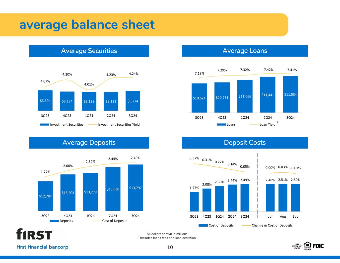 净利息收入&保证金9净利息保证金(FTE)2Q24 NIM(FTE)Progression Net Interest Income All dollars shown in millions $ 151.0 $ 148.4 $ 143.9 $ 147.7 $ 150.9 $ 3.8 $ 3.6 $ 4.0 $ 5.2 $ 4.5 $ 155.6 $ 153.3 $ 148.7 $ 153.8 $ 155.5 3Q242Q241Q244Q233Q23基本NII贷款费用3.98% 4.00% 3.99% 4.12% 4.21% 0.10% 0.10% 0.11% 0.14% 0.12% 4.08% 4.10% 4.10% 4.26% 4.33% 3Q242Q241Q244Q233Q23基本保证金(FTE)贷款费用2Q24 4.10%资产收益率/组合-0.01 %融资成本/组合-0.01 % 3Q24 4.08%