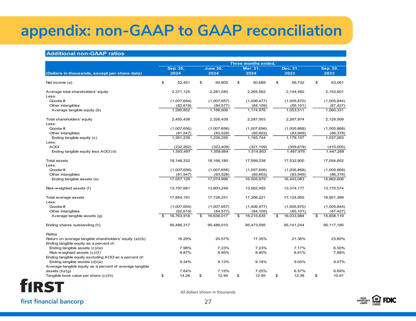 附录:Non-GAAP与GAAP对账27所有美元显示为千美元额外非GAAP比率9月30日、6月30日、3月31日、12月31日、9月30日,(千美元,每股数据除外)20242024202420232023净收益(a)52,451美元60,805美元50,689美元56,732美元63,061美元平均股东权益总额2,371,1252,281,0402,265,5622,144,4822,153,601减:商誉不良(1,007,654)(1,007,657)(1,006,477)(1,005,870)(1,005,844)其他无形资产(82,619)(84,577)(84,109)(85,101)(87,427)平均有形权益(b)1,280,8521,188,8061,174,9761,053,5111,060,331股东权益总额2,450,4382总资产18,146,33218,166,18017,599,23817,532,90017,054,852减:商誉不良(1,007,656)(1,007,656)(1,007,656)(1,005,868)(1,005,868)其他无形资产(81,547)(83,528)(85,603)(83,949)(86,378)期末有形资产(e)17,057,12917,074,99616,505,97916,443,08315,962,606 Risk-w eighted assets(f)13,797,68113,803,24913,562,45513,374,17713,170,574平均资产总额17,8占期末有形资产(c)/(e)7.98% 7.23% 7.23% 7.17% 6.50%风险-w八资产(c)/(f)9.87% 8.95% 8.80%(8.81%)7.88%期末不含AOCI的有形权益占比:期末有形资产(d)/(e)9.34% 9.13% 9.18% 9.05% 9.07%平均有形权益占平均有形资产的百分比(b)/(g)7.64% 7.15% 7.25% 6.57% 6.69%每股有形账面价值(c)/(h)14.26美元12.94美元12.50美元12.38美元10.91美元截至3个月,