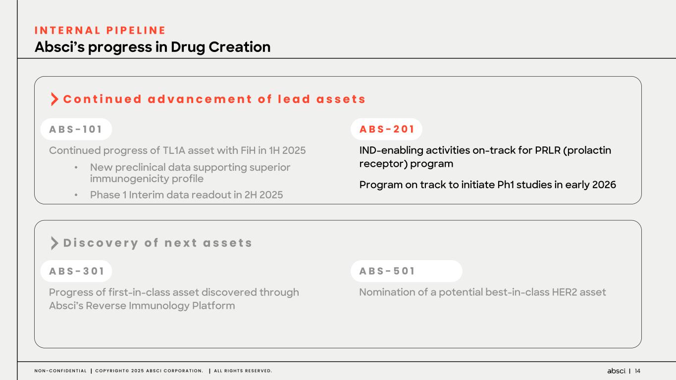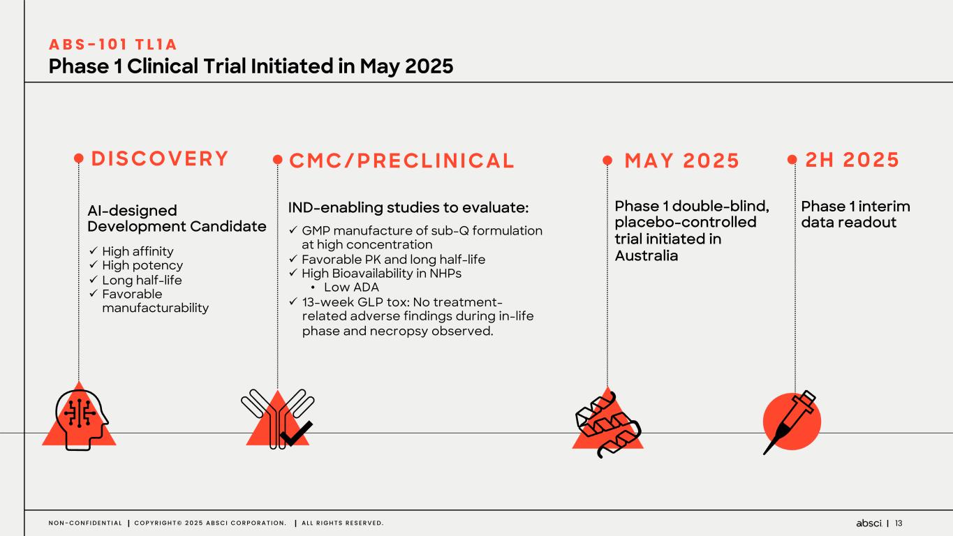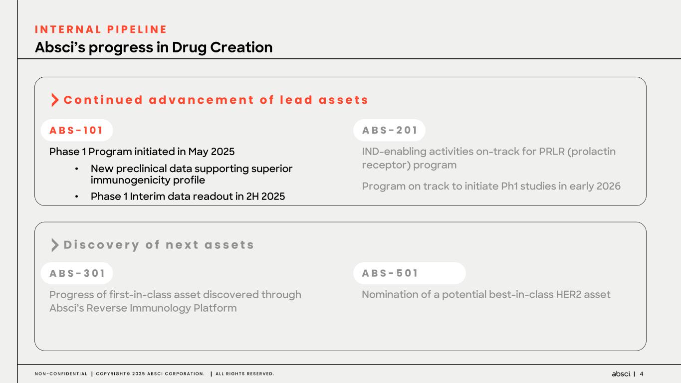 3N O N-C O N F I D E N T I A L C O P Y R I G H T©2025 A B S C I C O R P O R A T I O N. A L L R I G H T S R E S E R V E D. INFL。肠病/TL1A雄激素性脱发/PRLR免疫肿瘤学/未披露的额外早期发现项目针对先导ID候选ID ID IND启用ABS-101 ABS-201 ABS-301 1期肿瘤学/HER2 ABS-501 IND*治疗领域/目标DC推进和扩展我们使用AI Lead设计的新型和差异化资产管道*或同等的美国前申报A B S-101 PH1研究启动,中期数据读数2H25。新的临床前数据支持潜在的优越免疫原性特征。KEY Highlights A BS-2 0 1 category defining PRLR抗体治疗雄激素性脱发。发起的IND赋能活动,有潜力成为美国市场第一。A B S-301通过Absci的逆向免疫学平台发现的潜在first-in-class资产A B S-501用于使用从头AI A I P I P E L I N E设计的新型HER2程序的候选ID期