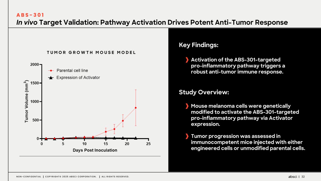 32N O N-C O N F I D E N T I A L C O P Y R I G H T©2025 A B S C I C O R P O R A T I O N. A L L R I G H T S R E S E R V E D.体内靶点验证:通路激活驱动有效的抗肿瘤反应A B S-3 0 1关键发现:ABS-301 –靶向促炎通路的激活触发强大的抗肿瘤免疫反应。研究综述:对小鼠黑色素瘤细胞进行基因改造,通过激活剂表达激活ABS-301 –靶向促炎通路。在注射了工程化细胞或未修饰亲代细胞的免疫活性小鼠中评估了肿瘤进展。T U M O R G R O W T H M O U S E M O D E L