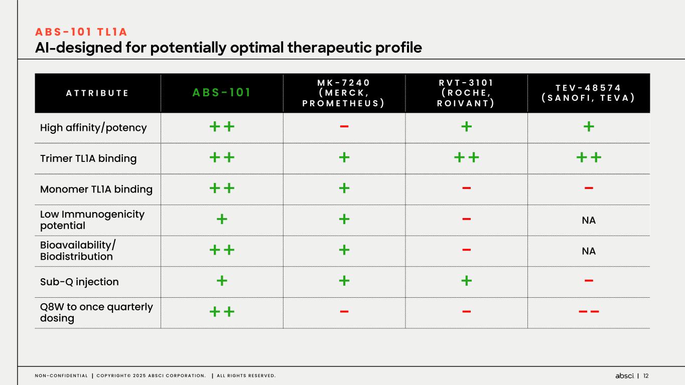 8N O N-C O N F I D E N T I A L C O P Y R I G H T©2025 A B S C I C O R P O R A T I O N. A L L R I G H T S R E S E R V E D. 11010010001101001000 Monom er Bind ing ing(pm)Tr im er B in di ng(p m)no m onomer Binding ing ing H I G H A F F I N IT Y M A B S W I T H B I N D I N G T O T H T H E T L 1 A M O N O M E R A N D T R I M E R A I-O P T I M I Z E D L O W P M A F F I N I T Y T R A N S L A T E S U P E R I O R E Q U I V AL E N T P O T E N C Y in cr ea si ng p ot en cy IC 50(nM)02468 1012 ABS-10 1 RVT-3 101 #(R oche)MK-7 240 #(M erc k)AAI设计的高亲和力候选药物在TF-1细胞安全系数中的凋亡抑制分析和优越的效力A B S-101 T L 1 A在CRE中增加亲和力ea si ng a ff in ity弱单体结合ABS-101 RVT-3101 #(罗氏)MK-7240 #(默沙东)TEV-48574 #(赛诺菲)#估计的性能产生的推定临床竞争分子进行内部比较