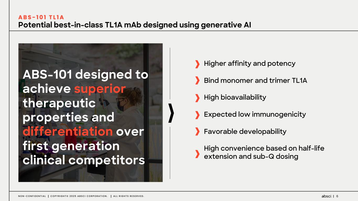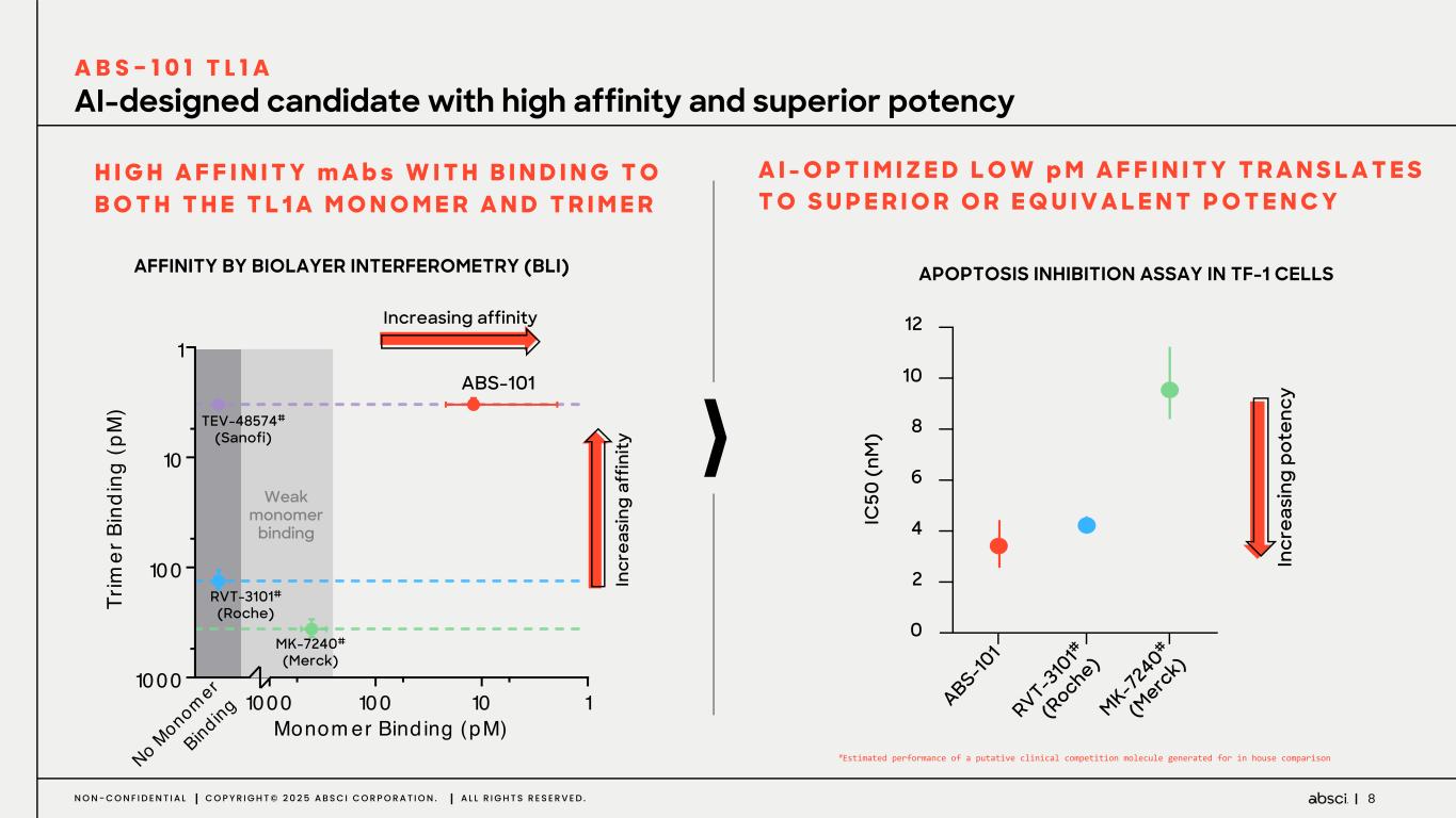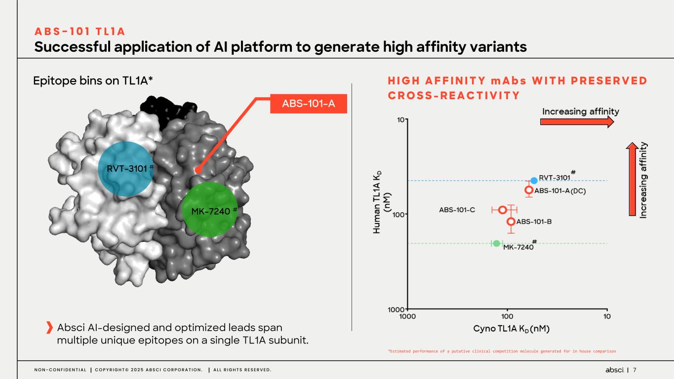 7N O N-C O N F I D E N T I A L C O P Y R I G H T©2025 A B S C I C O R P O R A T I O N. A L L R I G H T S R E S E R V E D.成功应用AI平台生成高亲和力变异A B S-101 T L 1 A H I G H A F F I N I T Y M AB S W I T H P R E S E R V E D C R O S-R E A C T I V I V I T Y MK-7240 # RVT-3101 # TL1A上的表位bins*ABS-101-A Absci AI设计和优化的引线跨越单个TL1A亚基上的多个独特表位。#为内部比较生成的假定临床竞争分子的估计性能