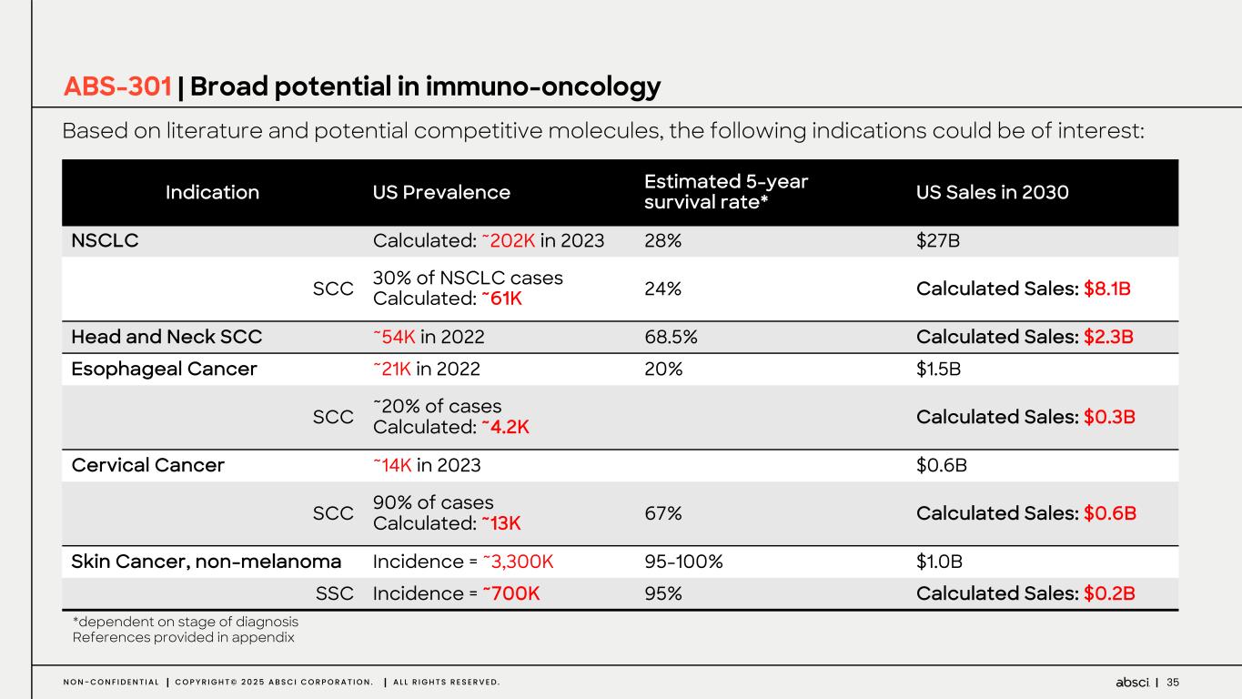 35N O N-C O N F I D E N T I A L C O P Y R I G H T©2025 A B S C I C O R P O R A T I O N. A L L R I G H T S R E S E R V E D. ABS-301 |基于文献和潜在竞争分子的免疫肿瘤学领域的广泛潜力,以下迹象可能令人感兴趣:*取决于阑尾适应症中提供的诊断参考资料美国患病率估计5年生存率*美国2030年销售额NSCLC计算:2023年~202K 28% $ 27B SCC 30% NSCLC病例计算:~61K 24%计算销售额:2022年$ 8.1B头颈SCC~54K 68.5%计算销售额:2022年$ 2.3B食管癌~21K 20% $ 1.5B SCC~20%病例计算:~4.2K计算销售额:2023年$ 0.3B宫颈癌~14K $ 0.6B SCC 90%病例计算:~13K 67%计算销售额:$ 0.6B皮肤癌,非黑色素瘤发病率=~3,300K 95-100 % $ 1.0B SSC发病率=~700K 95%计算销售额:$ 0.2B
