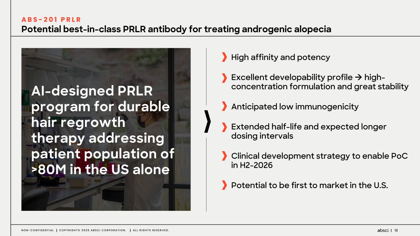 18N O N-C O N F I D E N T I A L C O P Y R I G H T©2025 A B S C I C O R P O R A T I O N. A L L R I G H T S R E S E R V E D.治疗雄激素性脱发的潜在同类最佳PRLR抗体A B S-2 0 1 P R L R AI设计的PRLR方案用于解决仅在美国超过80M患者群体的持久毛发再生疗法高亲和力和效力卓越的可开发性特征à高浓度配方和高度稳定性预期低免疫原性延长半衰期和预期更长的给药间隔临床开发战略,使POC在H2-2026有可能在美国率先上市。