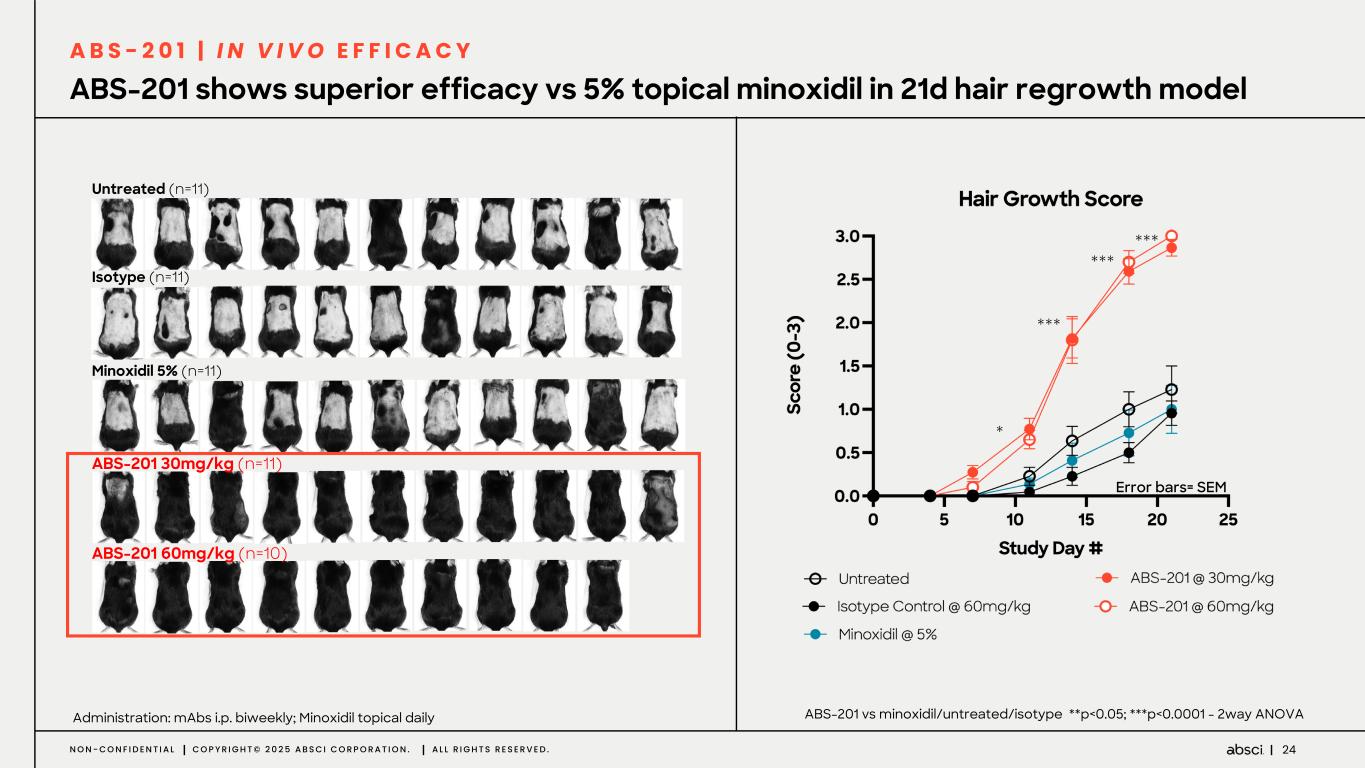 24N O N-C O N F I D E N T I A L C O P Y R I G H T©2025 A B S C I C O R P O R A T I O N. A L L R I G H T S R E S E R V E D. ABS-201在21d毛发再生模型中显示出优于5%外用米诺地尔的疗效给药:mabs i.p.双周;米诺地尔外用每日未治疗(n = 11)同型(n = 11)米诺地尔5%(n = 11)ABS-201 30mg/kg(n = 11)ABS-201 60mg/kg(n = 10)ABS-201 vs米诺地尔/未处理/同种型**p < 0.05;***p < 0.0001-2way ANOVA误差条= SEM**********A B S-201 | I N V I V O E F F I C A C Y
