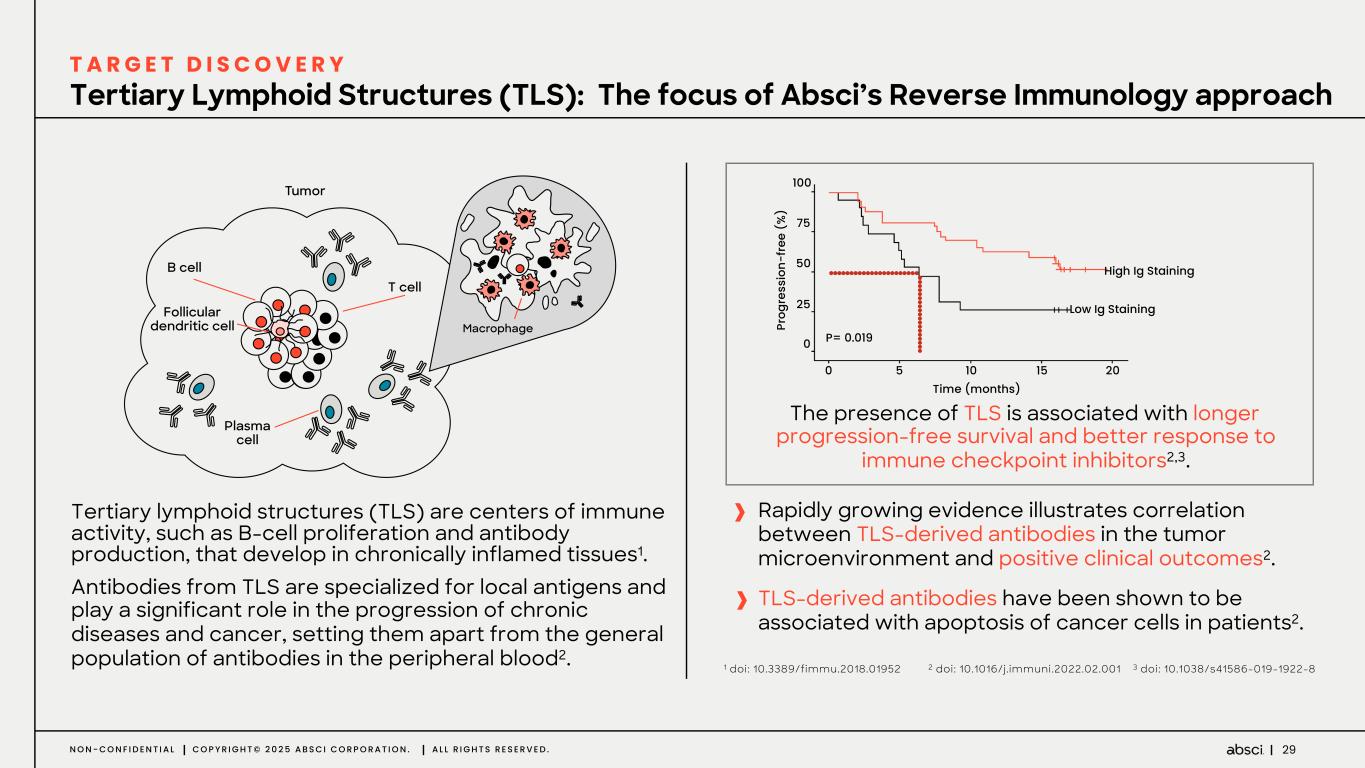 29N O N-C O N F I D E N T I A L C O P Y R I G H T©2025 A B S C I C O R P O R A T I O N. A L L R I G H T S R E S E R V E D. TLS的存在与更长的无进展生存期和对免疫检查点抑制剂的更好反应有关2,3。快速增长的证据说明了肿瘤微环境中TLS衍生抗体与阳性临床结果之间的相关性2。TLS衍生抗体已被证明与患者癌细胞凋亡有关2。三级淋巴结构(TLS)是免疫活动的中心,例如B细胞增殖和抗体产生,在慢性炎症组织中发展1。来自TLS的抗体专门用于局部抗原,在慢性疾病和癌症的进展中发挥着重要作用,使其有别于外周血中抗体的一般人群2。100755025101520005高IG染色低IG染色PR og re ss io n-fr ee(%)时间(月)p = 0.019三级淋巴结构(TLS):Absci逆向免疫学方法T A R G E T D I S C O V E R Y 1 doi:10.3389/fimmu.2018.0 19522 doi:10.10 16/j.immuni.2022.02.001 3 doi:10.1038/s41586-019-1922-8