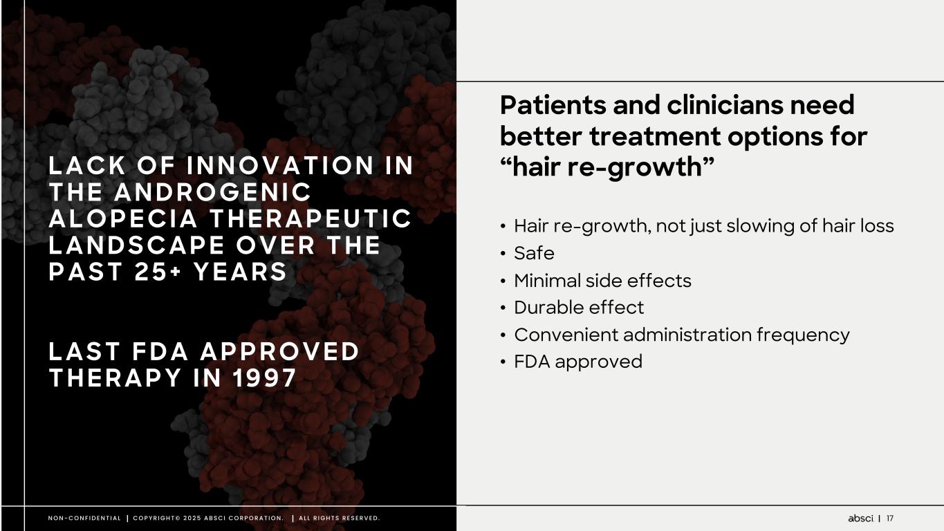 16N O N-C O N F I D E N T I A L C O P Y R I G H T©2025 A B S C I C O R P O R A T I O N. A L L R I G H T S R E S E R V E D.寻求治疗创新的服务不足的患者群体女性雄激素ALOPECIA~美国仅有1名FDA批准的疗法针对女性~5000万男性美国仅有2种FDA批准的疗法~8000万美国人与雄原性脱发患者同住男性雄原性脱发患者群体不断增加,治疗选择有限且担心不良副作用上一次FDA批准的雄原性脱发疗法是在上世纪90年代,患者和临床医生需要更好的治疗方案来“头发重新生长”,而不仅仅是减缓脱发安全且副作用最小的持久给药频率FDA批准了A B S-201 P R L R