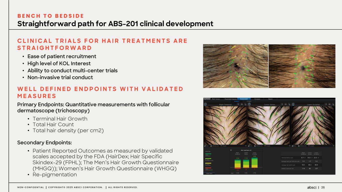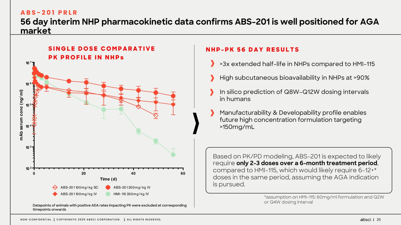 25N O N-C O N F I D E N T I A L C O P Y R I G H T©2025 A B S C I C O R P O R A T I O N. A L L R I G H T S R E S E R V E D. 56天中期NHP药代动力学数据证实ABS-201处于有利位置对于AGA市场A B S-2 0 1 P R L R > 3x延长NHPs中的半衰期与HMI-115相比NHPs中的高皮下生物利用度在> 90%时对人体Q8W – Q12W给药间隔的计算机预测可制造性和可开发性曲线使未来的高浓度制剂靶向> 150mg/mL N H P-P K 56 d A Y R E S U L T S 0204060102103104105106107 NHPs中的单剂量比较PK曲线时间(d)m AB s er um c on c(n g/m l)ABS-201 100mg/kg SC ABS-201 100mg/kg IV ABS-201 300mg/kg IV HMI-115 300mg/kg IV影响PK的ADA率阳性动物的数据点在相应时间点起被排除在外S I N G L E D O S E C O M P A R A T I V E P K P R O F I L E I N N H P s*基于PK/PD建模对HMI-115:60mg/ml制剂和Q2W或Q4W给药间隔的假设,ABS-201预计在6个月的治疗期内可能只需要2-3剂,而HMI-115可能需要6-12 +*同期剂量,假设追求AGA指示。