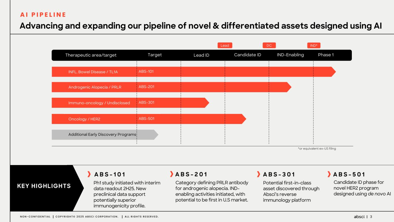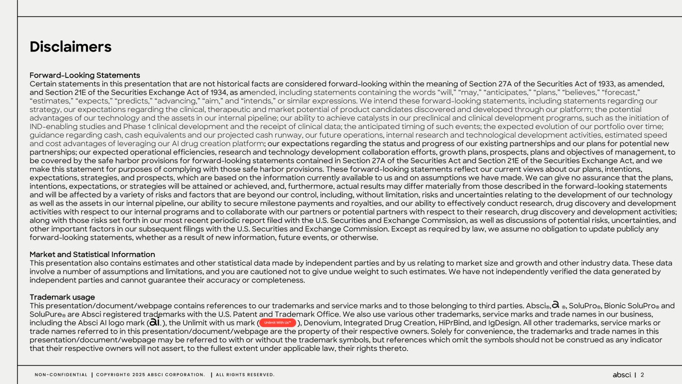 2N O N-C O N F I D E N T I A L C O P Y R I G H T©2025 A B S C I C O R P O R A T I O N. A L L R I G H T S R E S E R V E D.免责声明前瞻性陈述本演示文稿中某些非历史事实的陈述被视为经修订的1933年《证券法》第27A条含义内的前瞻性陈述,以及经修订的《1934年证券交易法》第21E条,包括包含“将”、“可能”、“预期”、“计划”、“相信”、“预测”、“估计”、“预期”、“预测”、“推进”、“目标”和“打算”等字样的声明,或类似表述。我们打算做出这些前瞻性陈述,包括关于我们的战略、我们对通过我们的平台发现和开发的候选产品的临床、治疗和市场潜力的预期;我们的技术和内部管道中的资产的潜在优势;我们在临床前和临床开发计划中实现催化剂的能力,例如启动IND授权研究和1期临床开发以及接收临床数据;此类事件的预期时间;随着时间的推移,我们投资组合的预期演变;关于现金、现金等价物和我们预计的现金跑道、我们未来的运营的指导,内部研究和技术开发活动、利用我们的AI药物创造平台的估计速度和成本优势;我们对现有合作伙伴关系的状态和进展的期望以及我们对潜在新合作伙伴关系的计划;我们预期的运营效率、研究和技术开发合作努力、增长计划、前景、计划和管理目标,将涵盖在《证券法》第27A节和《证券交易法》第21E节中包含的前瞻性陈述的安全港条款中,我们做出此声明是为了遵守这些安全港条款。这些前瞻性陈述反映了我们目前对我们的计划、意图、期望、战略和前景的看法,这些看法是基于我们目前可获得的信息和我们所做的假设。我们无法保证计划、意图、期望或战略将会实现或实现,此外,实际结果可能与前瞻性陈述中描述的结果存在重大差异,并将受到我们无法控制的各种风险和因素的影响,包括但不限于与我们的技术开发以及我们内部管道中的资产相关的风险和不确定性、我们获得里程碑付款和特许权使用费的能力,以及我们有效开展研究的能力,与我们的内部项目相关的药物发现和开发活动,以及与我们的合作伙伴或潜在合作伙伴就其研究、药物发现和开发活动进行合作;以及我们最近向美国证券交易委员会提交的定期报告中提出的风险,以及我们随后向美国证券交易委员会提交的文件中对潜在风险、不确定性和其他重要因素的讨论。除法律要求外,我们不承担公开更新任何前瞻性陈述的义务,无论是由于新信息、未来事件或其他原因。市场和统计信息本演示文稿还包含独立方和我们就市场规模和增长以及其他行业数据做出的估计和其他统计数据。这些数据涉及许多假设和限制,请注意不要对这些估计给予不应有的权重。我们未对独立方产生的数据进行独立验证,无法保证其准确性或完整性。商标使用本演示文稿/文件/网页包含对我们的商标和服务标志以及属于第三方的商标和服务标志的引用。Absci®,®,SoluPro®,仿生SoluPro®和SoluPure®是Absci在美国专利商标局注册的商标。我们还在业务中使用其他各种商标、服务标记和商号,包括Absci AI logo mark()、Unlimited with US mark()、Denovium、Integrated Drug Creation、HiPRBind、IGDesign。本演示文稿/文档/网页中提及的所有其他商标、服务标记或商品名称均为其各自所有者的财产。仅为方便起见,本演示文稿/文件/网页中的商标和商品名称可使用或不使用商标符号进行引用,但省略符号的引用不应被解释为其各自所有者不会根据适用法律在最大程度上主张其权利的任何指标。
