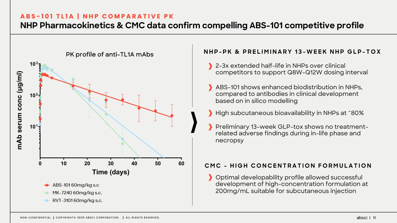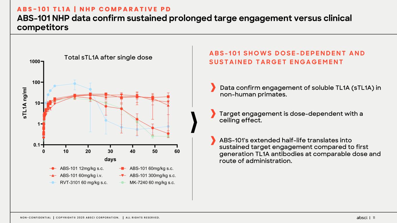 10N O N-C O N F I D E N T I A L C O P Y R I G H T©2025 A B S C I C O R P O R A T I O N. A L L R I G H T S R E S E R V E D. NHP药代动力学和CMC数据证实了令人信服的ABS-101竞争概况A B S-101 T L 1 A | N H P C O M P A R A T I V与支持Q8W-Q12W给药间隔的临床竞争对手相比,E P K2-3x延长了NHP的半衰期,ABS-101显示增强了NHP中的生物分布,与基于计算机建模的临床开发中的抗体相比,最佳可开发性曲线允许成功开发适用于皮下注射的200mg/mL的高浓度制剂C M C-H I G H C O N C E N T R A T I O N F O R M U L A T I O N初步的13周GLP-tox显示在生命中阶段没有与治疗相关的不良发现和尸检在~80% N H P-P K & P R E L I M I N A R Y 13-W E E K N H P G L P-T O XPK谱的抗TL1A单抗中的高皮下生物利用度