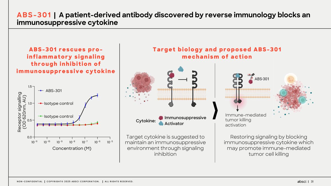 31N O N-C O N F I D E N T I A L C O P Y R I G H T©2025 A B S C I C O R P O R A T I O N. A L L R I G H T S R E S E R V E D. A B S-30 1 r e s c u e s p r o i n f l a m m a t o r y s i g n al i n g t h r o u g h i n h i b i t i o n o f i m m u n o s u p p r e s i v e c y t o k i n e a b s-3 0 1 |逆向免疫学发现的一种患者来源抗体,通过阻断可能促进免疫介导的肿瘤细胞杀伤的免疫抑制性细胞因子来阻断免疫抑制性细胞因子恢复信号,目标细胞因子被建议通过信号抑制来维持免疫抑制性环境re ce pt或s ig na llin g(O D 6 20 nm,A U)ABS-301同型对照同型对照浓度(M)免疫抑制激活剂免疫介导的肿瘤杀伤激活细胞因子:t a r g e t b i o l o g y a n d p r o p o s e d a b s-30 1 m e c h a n i s m o f a c t i o n