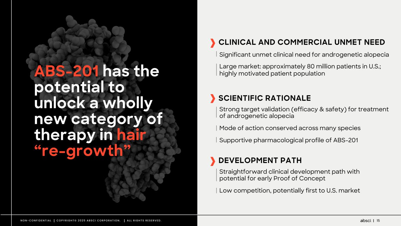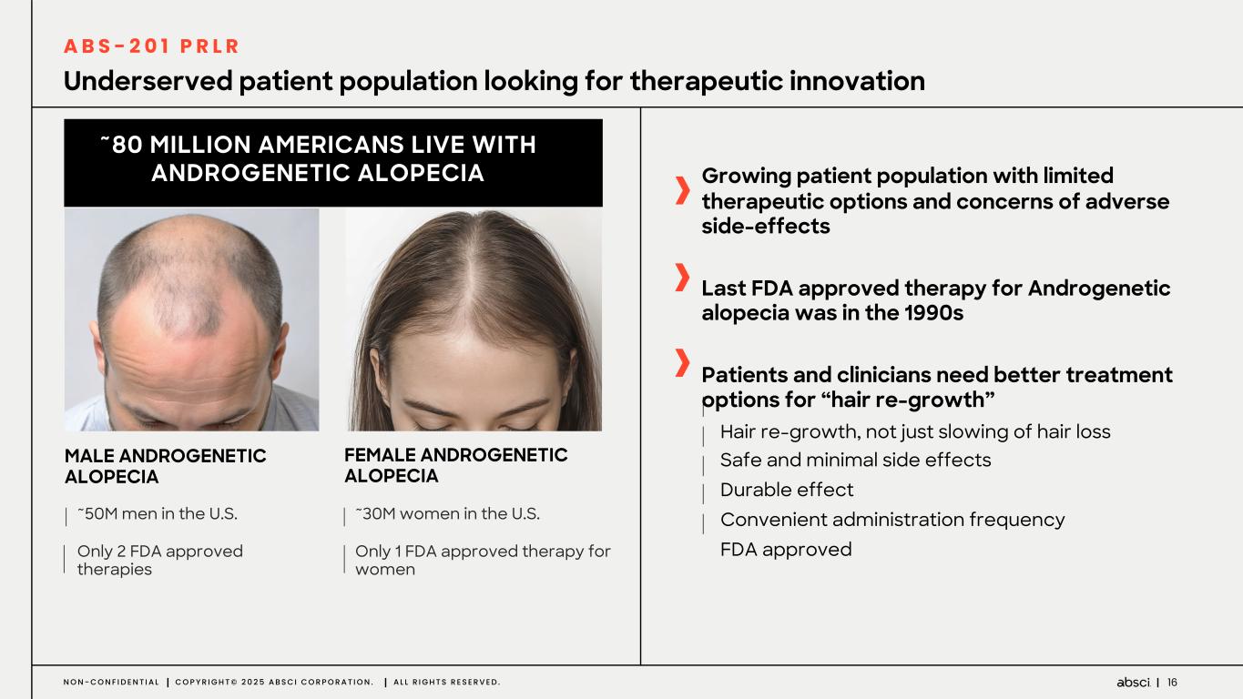 15N O N-C O N F I D E N T I A L C O P Y R I G H T©2025 A B S C I C O R P O R A T I O N. A L L R I G H T S R E S E R V E D. ABS-201有潜力在头发“再生长”中解锁全新类别的治疗显着未满足的临床需求针对雄激素性脱发的大市场:美国约有8000万患者;积极性高的患者群体临床和商业UNMET需要直截了当的临床开发路径,具有早期概念证明的潜力低竞争,可能率先进入美国市场开发路径用于治疗雄激素性脱发的强靶点验证(有效性和安全性)ABS-201科学理性的许多物种的支持药理学特征保守的作用模式