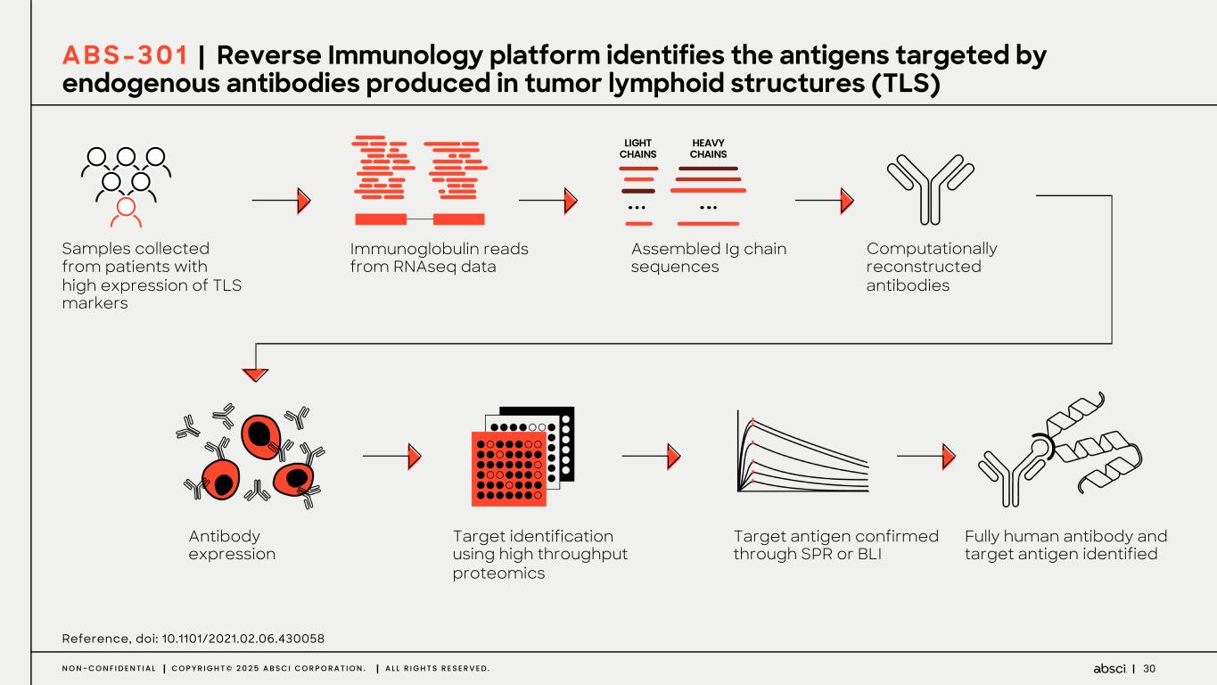 30N O N-C O N F I D E N T I A L C O P Y R I G H T©2025 A B S C I C O R P O R A T I O N. A L L R I G H T S R E S E R V E D. Light Chains HEAVY CHAINS样本采集自TLS标志物高表达患者的抗体表达免疫球蛋白从RNASEQ数据靶点识别中读取使用高通量蛋白质组学组装的IG链序列确认的靶点抗原通过SPR或BLI计算重构抗体全人源抗体和靶向抗原鉴定参考,doi:10.1 101/2021.0 2.06.430058 A B S-30 01 |逆免疫学平台鉴定肿瘤淋巴结构(TLS)中产生的内源性抗体靶向的抗原