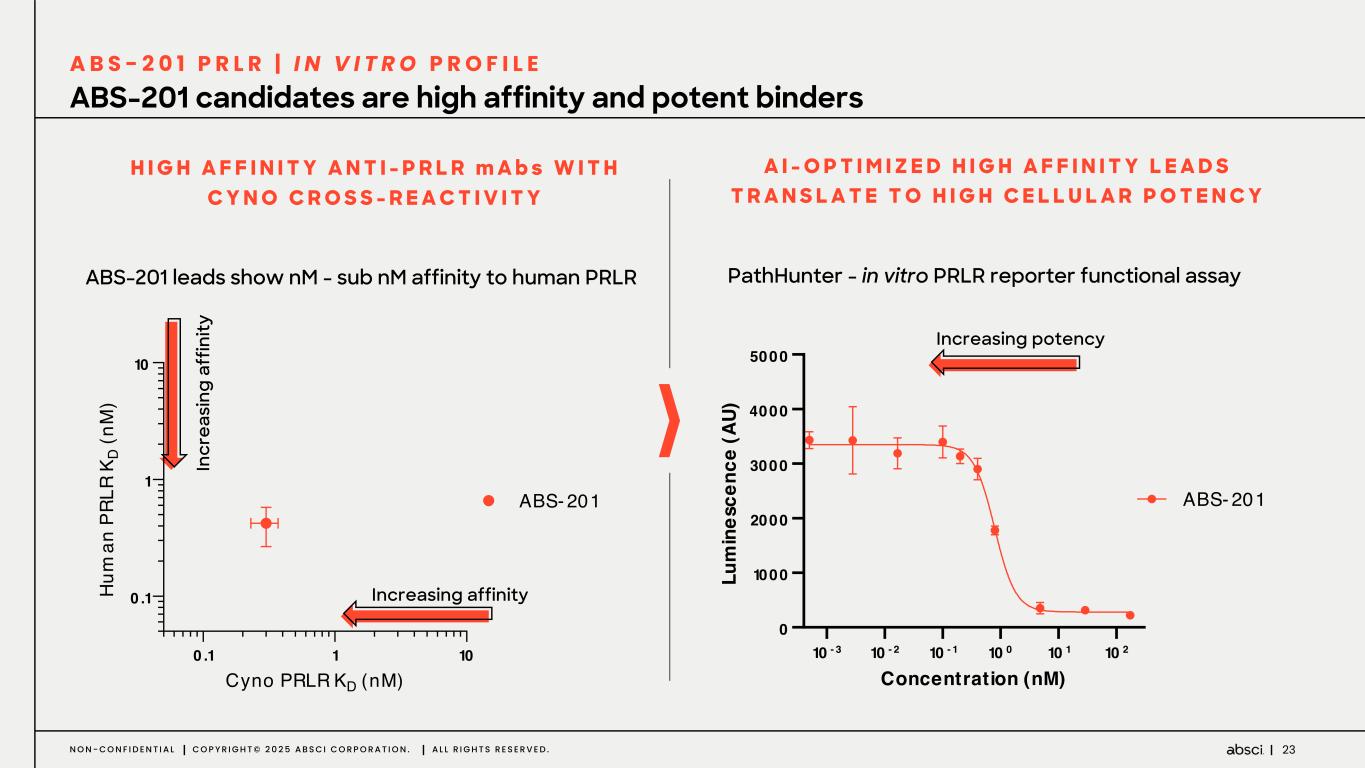 23N O N-C O N F I D E N T I A L C O P Y R I G H T©2025 A B S C I C O R P O R A T I O N. A L L R I G H T S R E S E R V E D. ABS-201候选高亲和力和强效粘合剂A B S-201 P R L R | I N V I T R O P R O F I L E PathHunter-体外PRLR报告因子功能测定10-3 10-2 10-1 100101102010002000300040005000浓度(nM)Lu m在es ce NC e(A U)ABS-201 ABS-201引线中显示出对人PRLR A I-O P T I M I Z E D H I G H A FF I N I T Y L E A D S T R A N S L A T E T O H I G H C E L U L A R P O T E N C Y in cr ea si ng a ff in ity增加效力0.11 100.11 10 Cyno PRLR KD(nM)H um an P RL R K D(nM)ABS-201增加亲和力H I G H A F F I N I T Y A N T I-P R LR M A B S W I T H C Y N O C R O S S-R E A C T I V I T Y