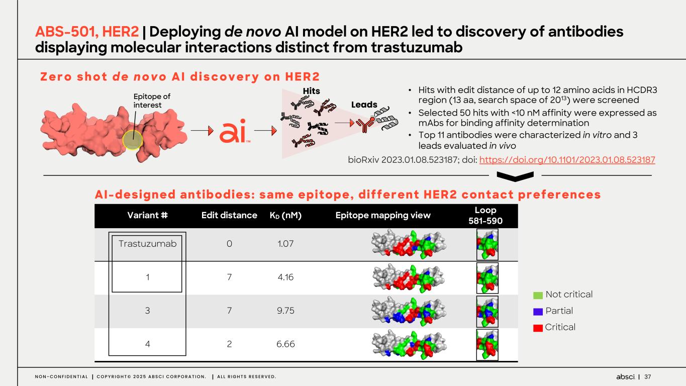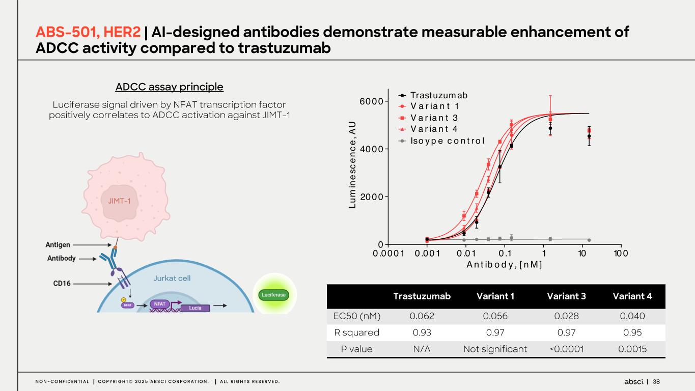 37N O N-C O N F I D E N T I A L C O P Y R I G H T©2025 A B S C I C O R P O R A T I O N. A L L R I G H T S R E S E R V E D. • HCDR3区域编辑距离高达12个氨基酸的hits(13 aa,2013年搜索空间)进行了筛选•筛选出50个< 10nm亲和力的hit,以mAB表达,用于结合亲和力测定•在体外对前11个抗体进行了表征,并在体内对3个先导ABS-501进行了评估,HER2 |在HER2上部署从头AI模型导致发现抗体显示出与曲妥珠单抗变异株不同的分子相互作用#编辑距离KD(nM)表位映射视图循环581-590曲妥珠单抗01.07 174.16 379.75 426.66部分临界非临界Z e r o s h o t d e n o v o a i d i s c o v e r y o n h e r 2 AI设计的抗体:相同的表位,不同的HER2接触偏好感兴趣的表位命中导致bioRXiv 2023.01.08.523187;doi:https://doi.org/10.1101/2023.01.08.523187