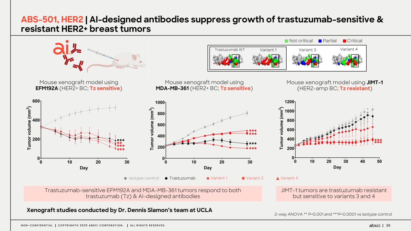 39N O N-C O N F I D E N T I A L C O P Y R I G H T©2025 A B S C I C O R P O R A T I O N. A L L R I G H T S R E S E R V E D. ABS-501,HER2 | AI设计的抗体抑制曲妥珠单抗敏感和耐药的HER2 +乳腺肿瘤的生长局部临界非临界曲妥珠单抗WT变异1变异3变异4小鼠异种移植模型使用EFM192A(HER2 + BC;TZ敏感)小鼠异种移植模型使用JIMT-1(HER2-amp BC;TZ耐药)曲妥珠单抗敏感EFM192A和MDA-MB-361肿瘤对曲妥珠单抗(TZ)和AI设计的抗体异种移植研究均有反应,由Dennis Slamon博士团队在加州大学洛杉矶分校同型对照曲妥珠单抗变异1变异3变异4!"!#!$!!#!!%!!&!!D()*+ , -./0 -1 +, 2/ 3, , $ 4 !"!#!$!%!&!!#!!%!!D!!(!!"!!!"#!!)*+ ,- ./0 12 /3 -.41 5. .$ 6***************使用MDA-MB-361(HER2 + BC;TZ敏感)的小鼠异种移植模型!"!#!$!!#!!%!!&!!D!!"!!!()*+, - ./ 01 .2 ,- 30 4- - $ 5************2路ANOVA**P < 0.001和***P < 0.0001 vs同种型对照JIMT-1肿瘤曲妥珠单抗耐药但对变异株3和4敏感**