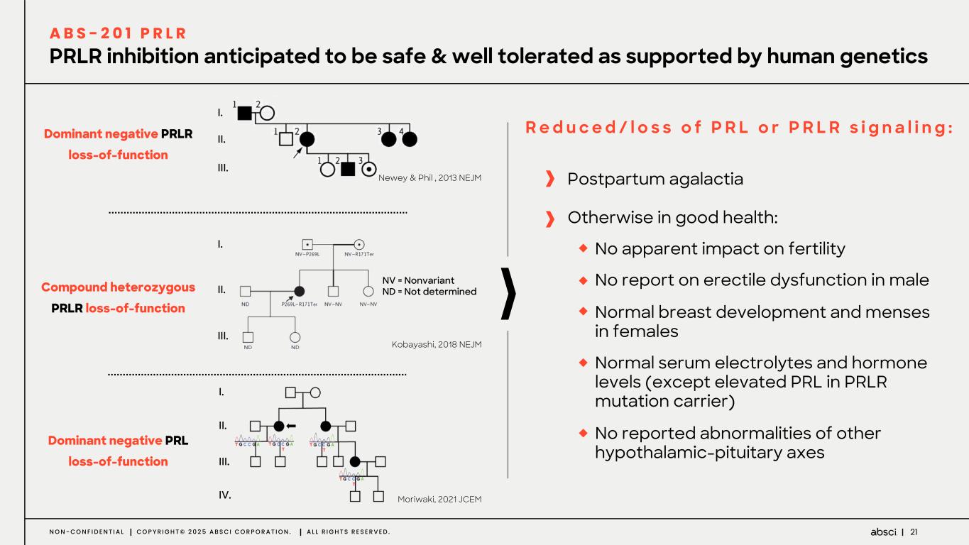 21N O N-C O N F I D E N T I A L C O P Y R I G H T©2025 A B S C I C O R P O R A T I O N. A L L R I G H T S R E S E R V E D. PRLR抑制预计是安全的&耐受性良好,得到人类遗传学A B S-2 0 1 P R L R I. II的支持。iii.NV =非变量ND =未确定一、二、iii.一、二、iii.iv.Kobayashi,2018 NEJM Moriwaki,2021 JCEM Newey & Phil,2013年NEJM复合杂合PRLR功能丧失显性阴性PRL功能丧失显性阴性PRLR功能丧失R e d u c e d/l o s o f P R L o r P R L R s i g n a l i n g:产后无乳化否则健康状况良好:对生育没有明显影响没有关于男性正常乳房发育和女性月经中勃起功能障碍的报告正常血清电解质和激素水平(PRLR突变携带者PRL升高除外)没有关于其他下丘脑-垂体轴异常的报告