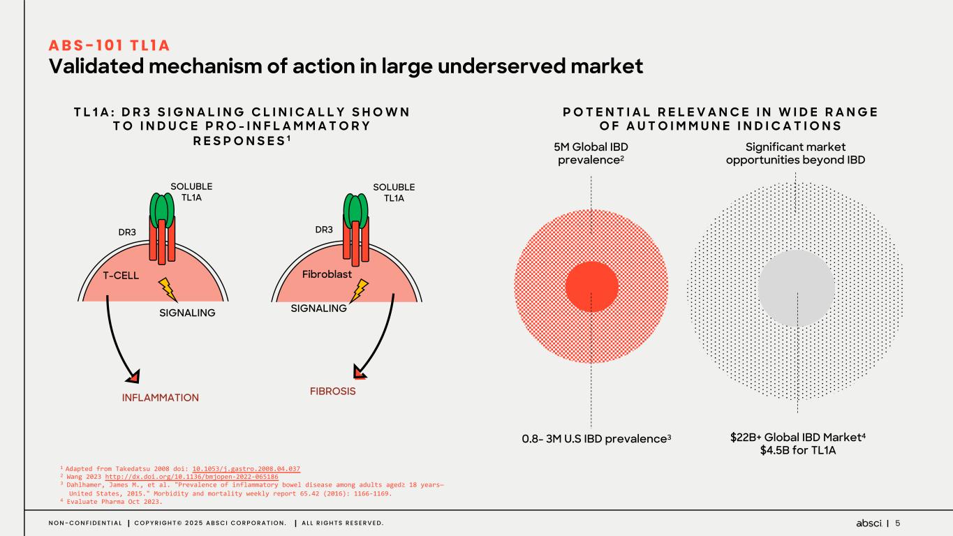 5N O N-C O N F I D E N T I A L C O P Y R I G H T©2025 A B S C I C O R P O R A T I O N. A L L R I G H T S R E S E R V E D.在服务不足的大型市场A B S-101 T L 1 A P O T E N T I A L R E L E V A NC E I N W I D E R A N G E O F A U T O I M U N E I N D I C A T I O N S T L 1 A:D R 3 S I G N A L I N G C L I N I C A L L Y S H O W N T O I N D U C E P R O-I N F L A M M A T O R E S P O N SE S 1 TL1A以外的重要市场机会IBD $ 22B +全球IBD市场4 $ 4.5B for TL1A 0.8-IBD prevalence3 5m全球IBD prevalence2 1改编自Takedatsu 2008 doi:10.1053/j.gastro.2008.04.0372 Wang 2023 http://dx.doi.org/10.1136/bmjopen-2022-065186 3 Dahlhamer,James M.,et al.“≥ 18岁成年人中炎症性肠病的患病率——美国,2015年。”发病率和死亡率周报65.42(2016):1166-1169。4评估制药2023年10月。T细胞成纤维细胞信号信号信号纤维化可溶性TL1A DR3 DR3可溶性TL1A炎症