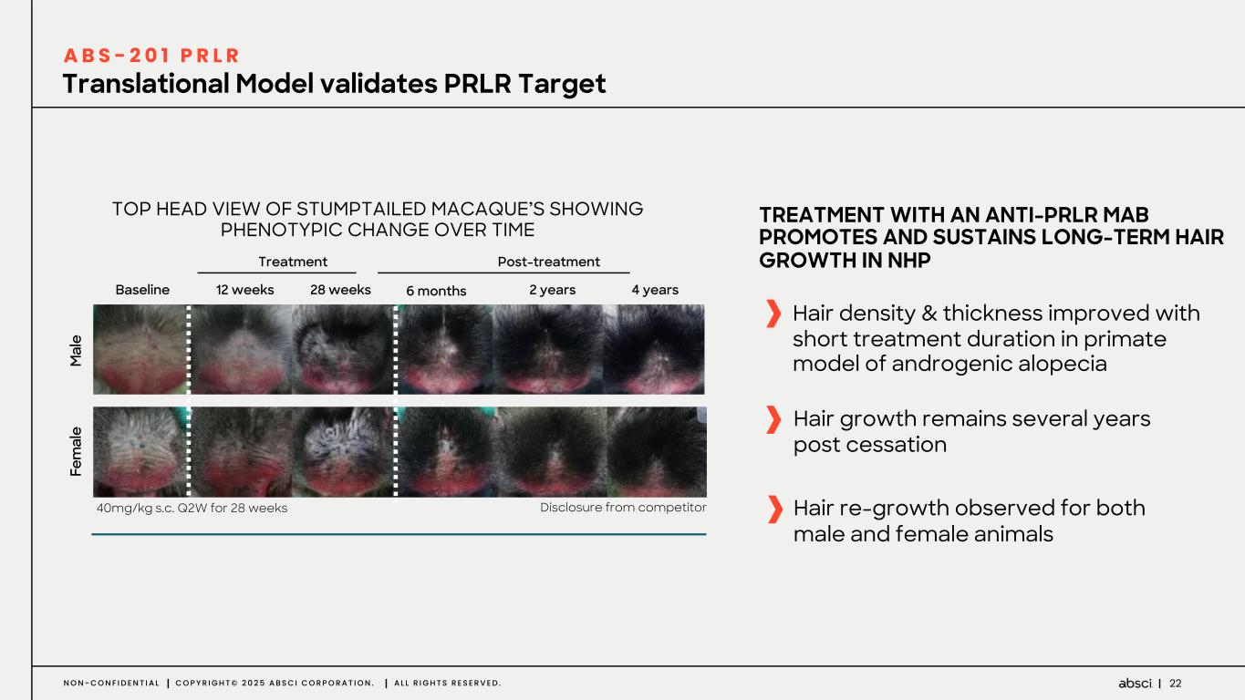 22N O N-C O N F I D E N T I A L C O P Y R I G H T©2025 A B S C I C O R P O R A T I O N. A L L R I G H T S R E S E R V E D.用抗PRLR单抗治疗可促进和维持NHP毛发密度和厚度的长期毛发生长,在雄激素性脱发灵长类动物模型中,治疗持续时间较短,毛发生长在停止后几年仍然保持雄性和雌性动物均观察到毛发重新生长顶头视图40mg/kg s.c. Q2W随时间的显象类型变化28周从竞争对手M al e fe m al e基线披露12周28周6个月2年4年治疗后转化模型验证PRLR目标A B S-2 0 1 P R L R