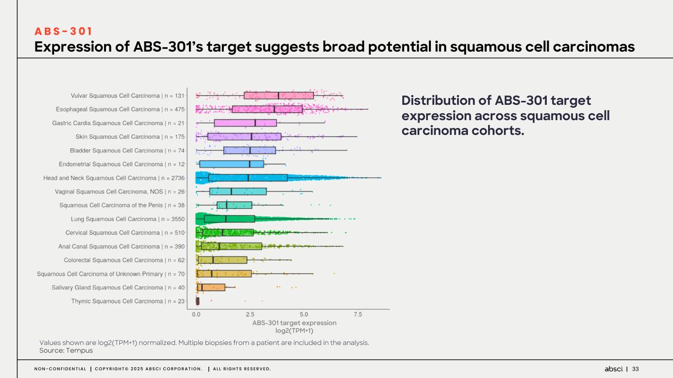 33N O N-C O N F I D E N T I A L C O P Y R I G H T©2025 A B S C I C O R P O R A T I O N. A L L R I G H T S R E S E R V E D. ABS-301靶点的表达表明在鳞癌中具有广泛的潜力A B S-3 01 ABS-301靶点表达在鳞癌队列中的分布。ABS-301目标表达式log2(TPM + 1)值显示为log2(TPM + 1)正规化。分析中包括来自患者的多个活检。资料来源:Tempus