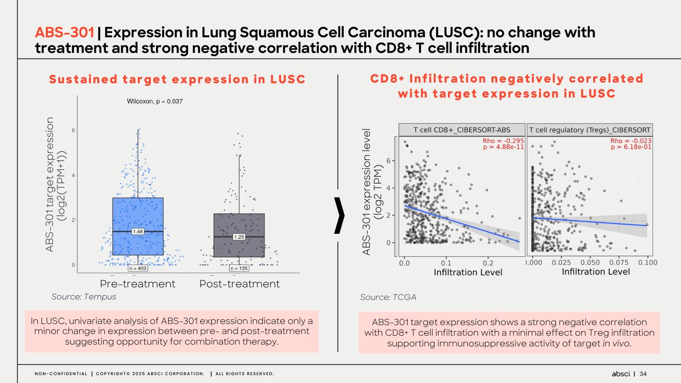 34N O N-C O N F I D E N T I A L C O P Y R I G H T©2025 A B S C I C O R P O R A T I O N. A L L R I G H T S R E S E R V E D. ABS-301 |在肺鳞癌(LUSC)中的表达:随治疗无变化,与LUSC中CD8 + T细胞浸润呈强负相关,ABS-301表达的单变量分析表明,治疗前和治疗后之间的表达仅有微小变化,这表明有机会进行联合治疗。S U S T A i n e d t a r g e t e x p r e s i o n i n l U S C ABS-301靶点表达与CD8 + T细胞浸润呈极强的负相关,对treg浸润的影响极小,支持靶点在体内的免疫抑制活性。C D 8 + i n f i l t r a t i o n e g a t i v e l y c o r e l a t e d w i t h t a r g e t e x p r e s s i o n i n l u s c来源:腾邦来源:TCGA预处理后处理A BS-3 01 ta rg et e xp re ss io n(lo g2(T PM + 1))A BS-3 01 e xp re ss io n le vel(lo g2 t PM)