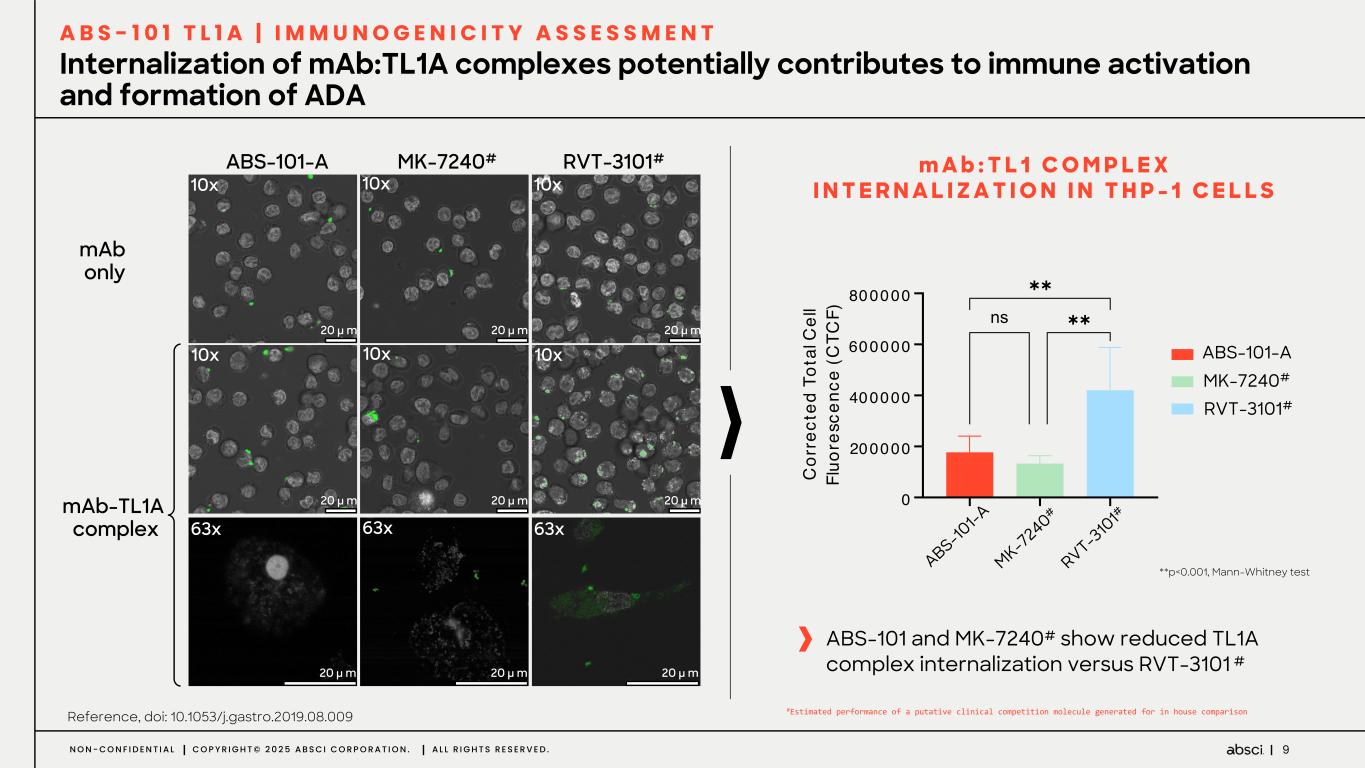 9N O N-C O N F I D E N T I A L C O P Y R I G H T©2025 A B S C I C O R P O R A T I O N. A L L R I G H T S R E S E R V E D. MAB的内化:TL1A复合物可能有助于免疫激活和组建ADA A B S-101 T L 1 A | I M M U N O G E N I C I T Y A S E S M E N T MAB仅ABS-101-A RVT-3101 # MK-7240 # 10x 10x 10x 10x 10x 10x 10x 63x 63x 20 μ m 20 μ m 20 μ m 20 μ m 20 μ m 20 μ m 20 μ m 20 μ m 20 μ m 20 μ m 20 μ m 20 μ m mAB-TL1A配合物m a b:T L 1 C O M P L E X I N T E R N A L I Z A T I O N I N T H P-1 C E L L S**p < 0.001,MAN-Whitney检验参考,doi:10.1053/j.gastro.2019.08.009 ABS-101和MK-7240 #显示与RVT-3101相比TL1A复杂内化降低# AB S-10 1 MK-7240 RV T-310 10200000400000600000800000 C或re ct ed T ot al C el l FL uo re SC en ce(C TC F)!" # AB & B '(a)*+ &,-KA/B & B M1!!!!ABS-101-A MK-7240 # RVT-3101 # S-10 1-A MK-7 240 # RVT-3 101 # #估计产生的推定临床竞争分子的性能,用于内部比较