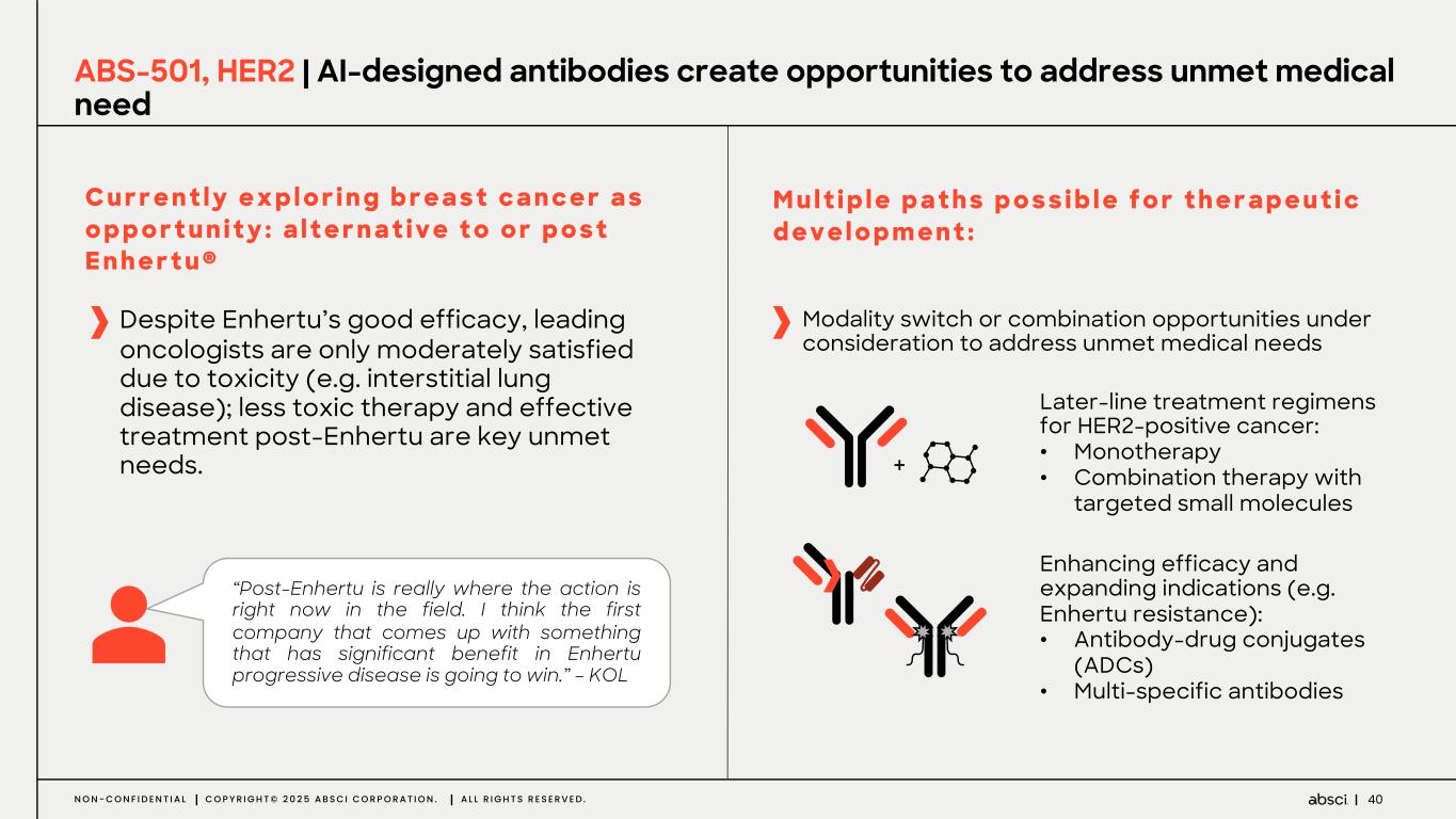 40N O N-C O N F I D E N T I A L C O P Y R I G H T©2025 A B S C I C O R P O R A T I O N. A L L R I G H T S R E S E R V E D. ABS-501,HER2 | AI设计的抗体为解决未满足的医疗需求创造了机会正在考虑的模式转换或组合机会,以解决未满足的医疗需求后期治疗方案针对HER2阳性癌症:•单一疗法•靶向小分子M u l t i p l e p a t h s p o s s i b l e f o r t h e r a p e u t i c d e v e l o p m e n t:c u r r e n t l y e x p l o r i n g b r e a s t c a n c e r a s o p p o r t u n it y:a l t e r n a t i v e t o r p o s t e n h e r t u®尽管Enhertu疗效良好,但由于毒性(例如间质性肺病),领先的肿瘤学家仅获得中等程度的满足;毒性较小的治疗和Enhertu后的有效治疗是关键的未满足需求。“Post-Enhertu确实是该领域目前的行动所在。我认为,第一家提出在Enhertu进展性疾病中具有显着益处的东西的公司将会获胜。”– KOL增强疗效和扩大适应症(例如Enhertu耐药):•抗体-药物偶联物(ADC)•多特异性抗体+
