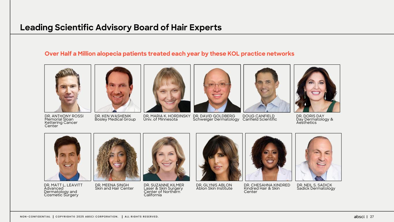 27N O N-C O N F I D E N T I A L C O P Y R I G H T©2025 A B S C I C O R P O R A T I O N. A L L R I G H T S R E S E R V E D.领先的头发专家科学顾问委员会Dr. ANTHONY ROSSI Memorial Sloan Kettering Cancer Center Dr. CHESHNA Kindred Kindred Hair & Skin Center Dr. Matt L. LEAVITT Advanced Dermatology和美容外科医生MEENA SINGH皮肤和毛发中心Dr. Maria K. HORDINSKY大学明尼苏达大学Dr. SUZANNE KILMER激光和皮肤外科中心北加州Dr. Ken Washenik Bosley医疗集团Dr. Glynis ABLON Ablon皮肤研究所Dr. NEIL S. SADICK Sadick皮肤科Dr. DORIS DAY Day皮肤科和美学这些KOL实践网络Dr. DAVID GOLDBERG Schweiger Dermatology DOUG CANFIELD Canfield Scientific每年治疗的脱发患者超过50万