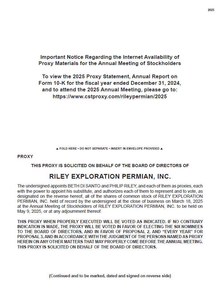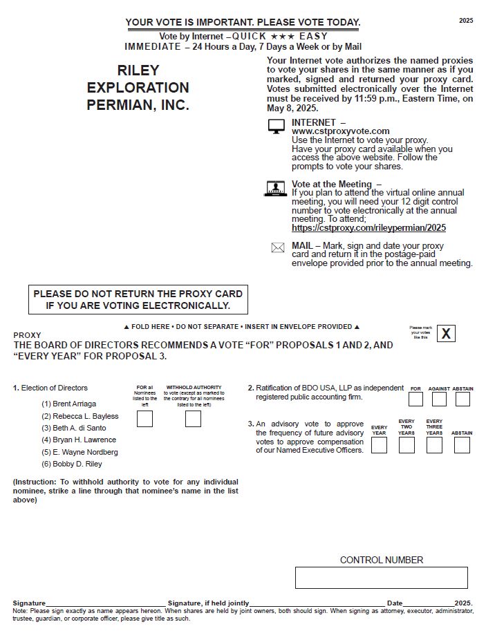 根据Bluescape资源公司LLC于2024年4月10日提交的附表13D/a。BluescapeRiley Exploration Holdings LLC是一家特拉华州有限责任公司,实益拥有公司普通股。Bluescape Energy资本重组和重组基金III LP对所持有的公司普通股拥有投票权和决定权,因此也可能被视为这些股份的实益拥有人。Bluescape Energy Partners III GP LLC是Bluescape Energy Capitalization and Restructuring Fund III LP的唯一普通合伙人,可能被视为分享对这些股份的投票权和决定权,因此也可能被视为这些股份的实益拥有人。Bluescape Resources GP Holdings LLC是Bluescape Energy Partners III GP LLC的管理人,可能被视为分享对这些股份的投票权和决定权,因此也可能被视为这些股份的实益拥有人。Bluescape Resources GP Holdings LLC的经理Charles John Wilder,Jr.可能被视为分享对这些股份的投票权和决定权,因此也可能被视为这些股份的实益拥有人。BluescapeRiley Exploration Acquisition LLC、BluescapeRiley Exploration Holdings LLC、Bluescape Energy Capitalization and Restructuring Fund III LP、Bluescape Energy Partners III GP LLC、Bluescape Resources GP Holdings LLC和Charles John Wilder,Jr.各自否认对报告中由BluescapeRiley Exploration Holdings LLC持有的股份的实益所有权,超过其各自在这些股份中的金钱权益。BluescapeRiley Exploration Holdings LLC的地址和每个上市受益所有人的邮寄地址是300 Crescent Court,Suite 1860,Dallas,Texas 75201。