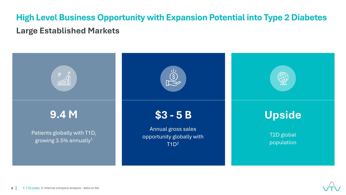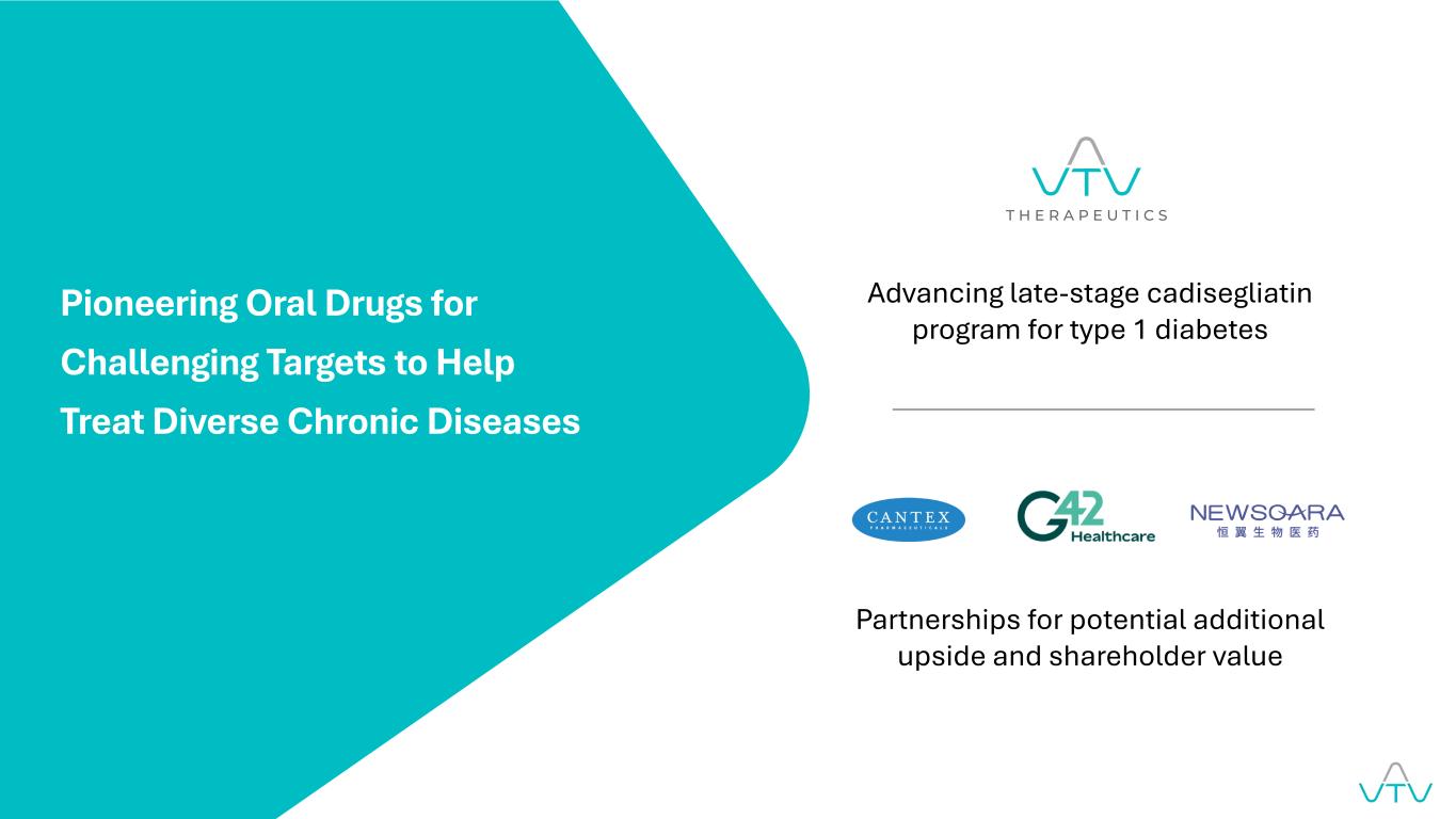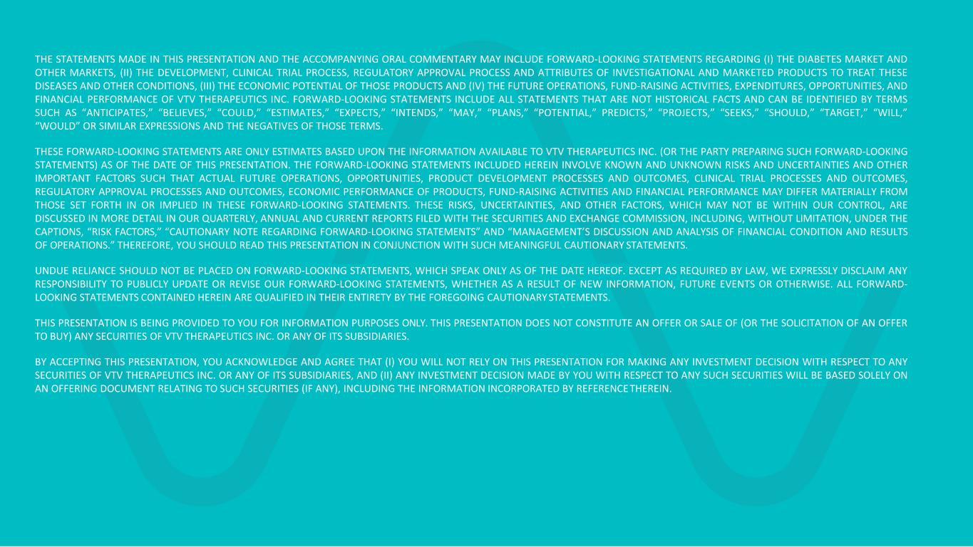 2本演示文稿中的陈述和随附的口头评论可能包括有关(i)糖尿病市场和其他市场的前瞻性陈述,(ii)为治疗这些疾病和其他情况而开展的调查和营销产品的发展、临床试验过程、监管批准过程和属性,(iii)THE的经济潜力前瞻性陈述包括所有非历史事实的陈述,可以用“预期”、“相信”、“可能”、“估计”、“预期”、“打算”、“可能”、“计划”、“潜力”、“预测”、“项目”、“寻求”、“应该”、“目标”、“将”、“将”或类似表述以及这些表述的负面这些前瞻性陈述仅基于截至本演示文稿发布之日VTV THERAPEUTICS INC.(或编制此类前瞻性陈述的一方)可获得的信息作出的估计。此处包含的前瞻性陈述涉及已知和未知的风险和不确定性以及其他重要因素,例如实际的未来运营、机会、产品开发过程和结果、临床试验过程和结果、监管审批过程和结果、产品的经济表现、筹资活动这些可能不在我们控制范围内的风险、不确定性和其他因素,在我们提交给证券交易委员会的季度、年度和当前报告中有更详细的讨论,包括但不限于标题下的“风险因素”、“关于前瞻性陈述的警示性说明”和“管理层的讨论和因此,您应该结合这些有意义的警示性声明阅读本演示文稿。不应过分依赖前瞻性声明,因为这些声明仅在本报告所述之日发表。除法律要求外,我们明确否认有任何责任公开更新或修订我们的前瞻性声明,无论是由于新信息、未来事件或其他原因。本报告所载的所有前瞻性陈述完全符合上述警示性陈述。本演示文稿仅供您参考。本演示文稿不构成对VTV THERAPEUTICS INC.的任何证券的要约或出售(或要约购买的邀约)。或其任何子公司。通过接受本演示文稿,即表示您承认并同意(i)您将不依赖本演示文稿就VTV THERAPEUTICS INC.的任何证券做出任何投资决定。或其任何附属公司,及(ii)贵公司就任何该等证券作出的任何投资决定,将完全基于与该等证券有关的发售文件(如有),包括其中提及的信息。