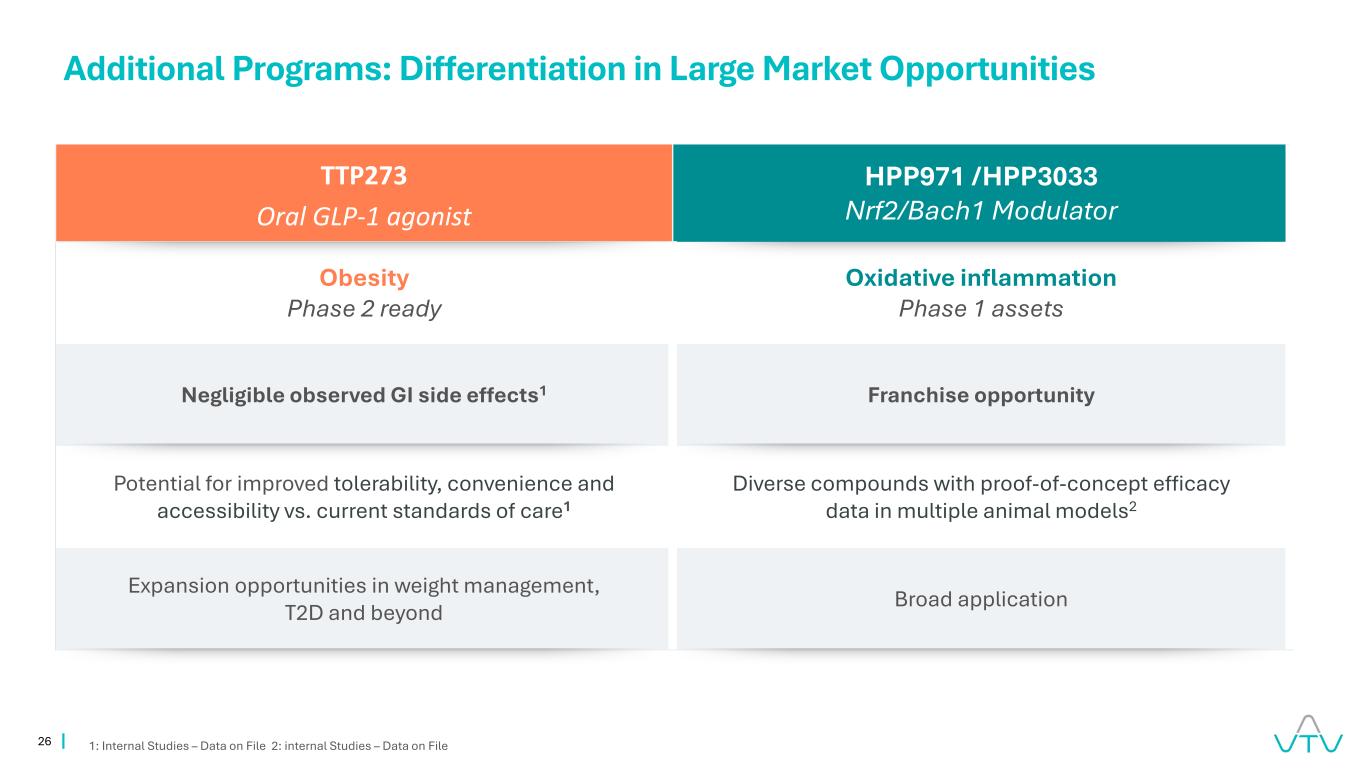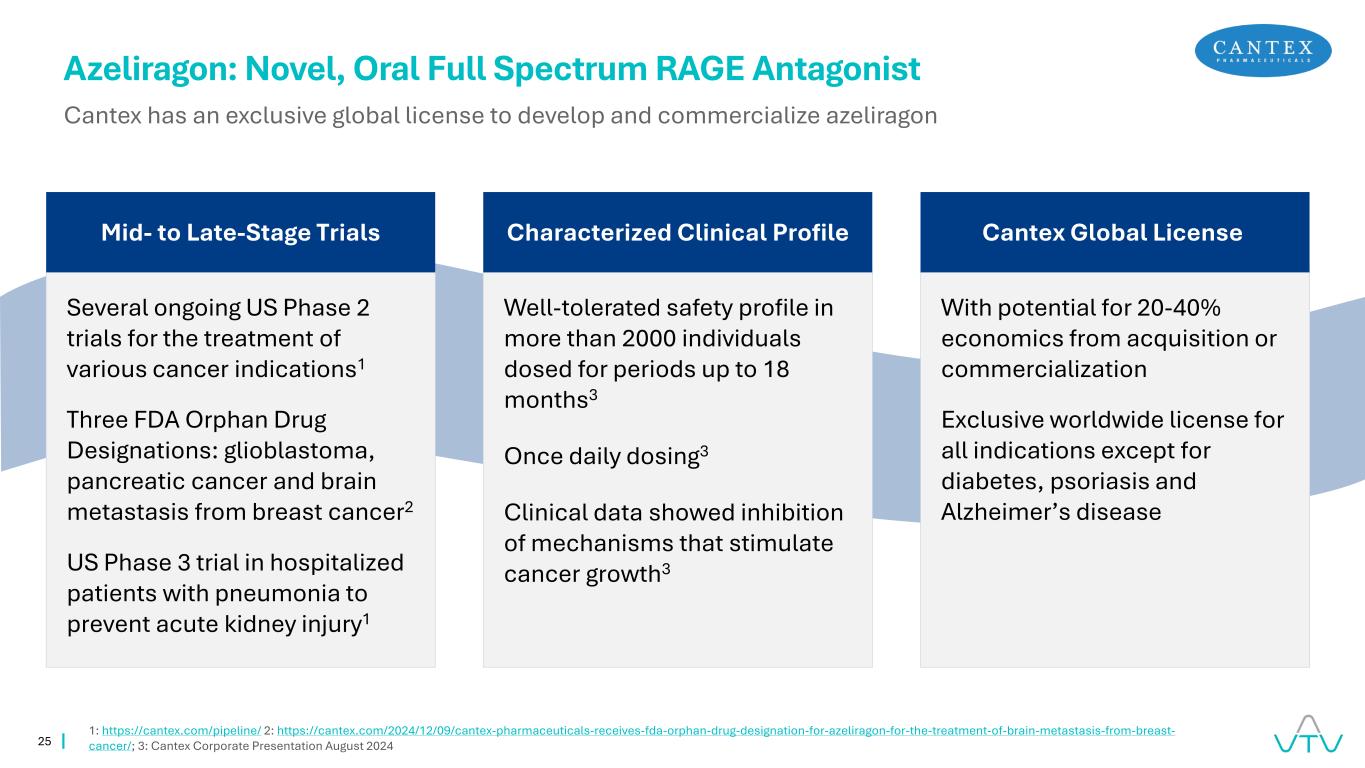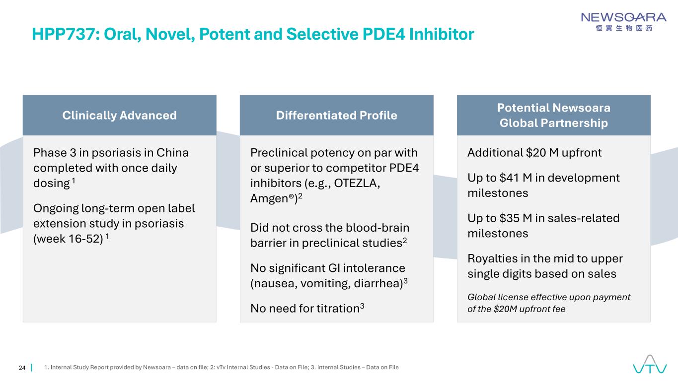 24 HPP737:口服、新型、强效和选择性PDE4抑制剂1。Newsoara提供的内部研究报告–档案数据;2:vTV内部研究-档案数据;3。内部研究–中国银屑病档案3期数据完成,每日一次给药1银屑病中正在进行的长期开放标签扩展研究(第16至52周)1临床前效力与竞争对手PDE4抑制剂(例如OTEZLA、安进)持平或优于®)2在临床前研究中未跨越血脑屏障2无明显的胃肠道不耐受(恶心、呕吐、腹泻)3无需滴定3额外2000万美元预付款最高4100万美元开发里程碑最高3500万美元销售相关里程碑特许权使用费中上个位数基于销售额全球许可在支付2000万美元预付款后生效临床先进差异化配置文件潜力Newsoara全球合作伙伴关系