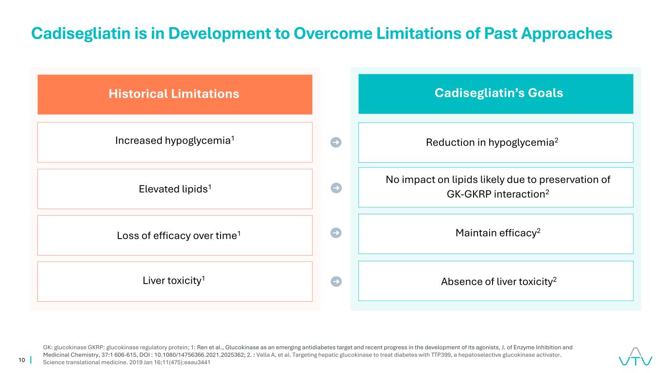 10低血糖增加1历史限制升高脂质1肝毒性1降低低血糖2 GK:葡萄糖激酶GKRP:葡萄糖激酶调节蛋白;1:Ren等人,葡萄糖激酶作为一种新兴的抗糖尿病靶点及其激动剂开发的最新进展,酶抑制与药物化学杂志,37:1 606-615,DOI:10.1080/14756366.2021.2025362;2。:Vella A,et al.靶向肝糖激酶治疗糖尿病的TTP399,一种肝选择性葡萄糖激酶激活剂。科学转化医学。2019年1月16日;11(475):eAU3441 Cadisegliatin正在开发中,以克服过去方法的局限性可能由于保存GK-GKRP相互作用而对脂质没有影响2 Cadisegliatin的目标随着时间的推移会失去功效1维持疗效2不存在肝毒性2