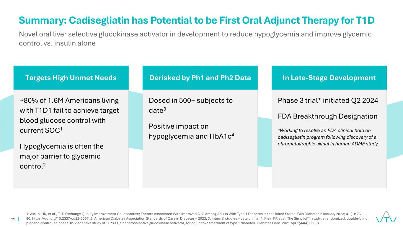29摘要:Cadisegliatin有潜力成为T1D新型口服肝脏选择性葡萄糖激酶激活剂的首个口服辅助疗法,与单独使用胰岛素相比,可降低低血糖并改善血糖控制1:Akturk HK等人,T1D交换质量改进合作;与美国1型糖尿病成人A1C改善相关的因素。Clin Diabetes 2023年1月2日;41(1):76 – 80。https://doi.org/10.2337/cd22-0067;2:美国糖尿病协会糖尿病护理标准– 2023;3:内部研究–存档数据;4:Klein KR等人的SimpliciT1研究:TTP399(一种肝选择性葡萄糖激酶激活剂)的辅助治疗1型糖尿病的随机、双盲、安慰剂对照1b/2期适应性研究。糖尿病护理。2021年4月1日;44(4):960-8~80%的160万美国人T1D1未达到目标血糖控制当前SOC1低血糖往往是血糖控制的主要障碍2给药至今500 +受试者3对低血糖和HBA1C4 3期试验的积极影响*启动2024年第二季度FDA突破性指定*在人类ADME研究中发现色谱信号后,致力于解决FDA对cadisegliatin计划的临床搁置,该研究针对的是后期开发中的Ph1和Ph2数据所衍生的高未满足需求