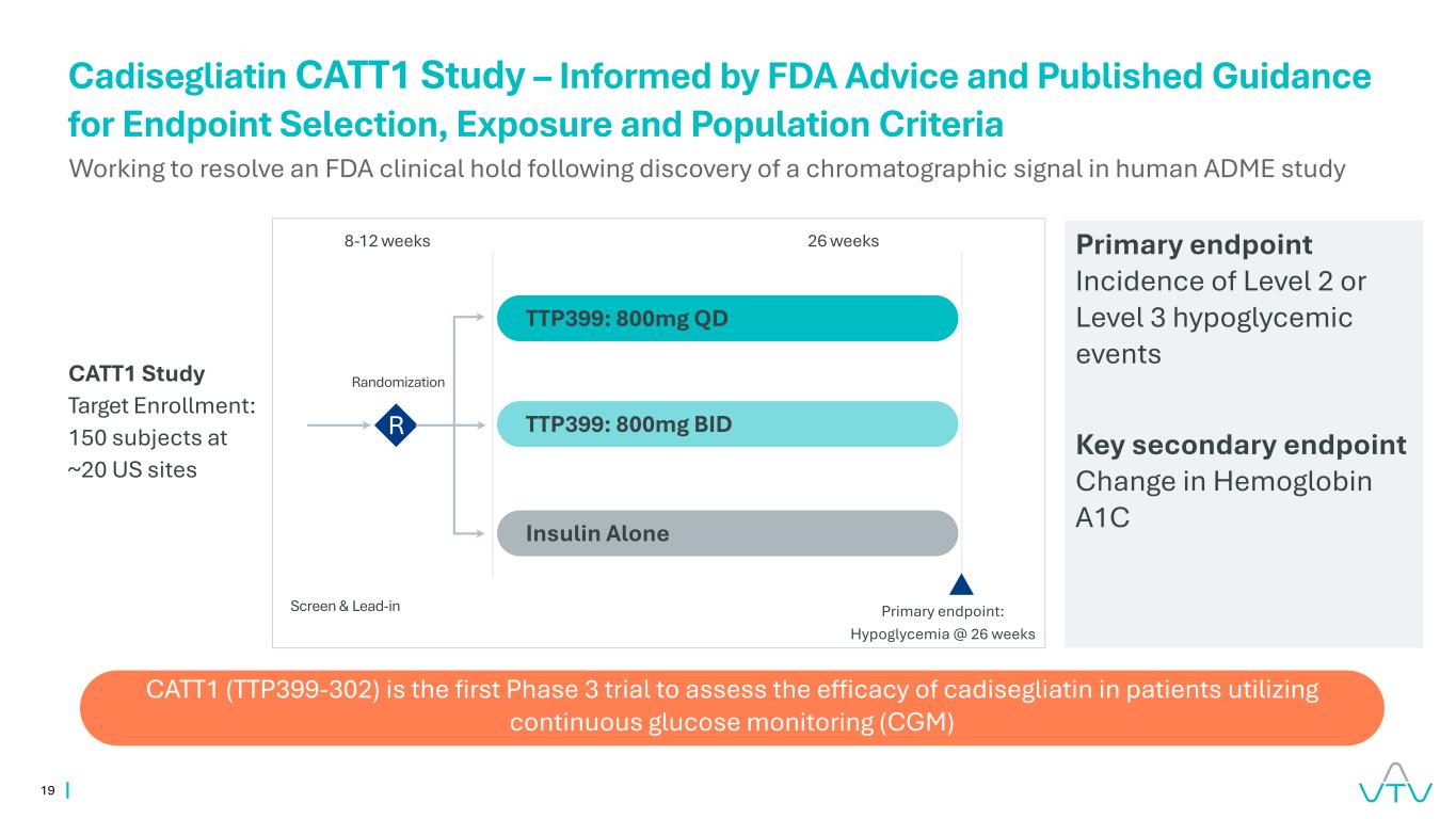 19项CATT1研究目标入组:约20个美国站点的150名受试者Cadisegliatin CATT1研究–根据FDA的建议和已发布的端点选择指南,暴露和人群标准CATT1(TTP399-302)是第一个利用持续血糖监测(CGM)主要终点2级或3级降糖事件发生率评估cadisegliatin在患者中疗效的3期试验血红蛋白A1C筛查和导入随机R主要终点的关键次要终点变化:低血糖@26周TTP399:800mg QD TTP399:800mg BID胰岛素单独26周8-12周的工作,以解决在人类ADME研究中发现色谱信号后的FDA临床搁置