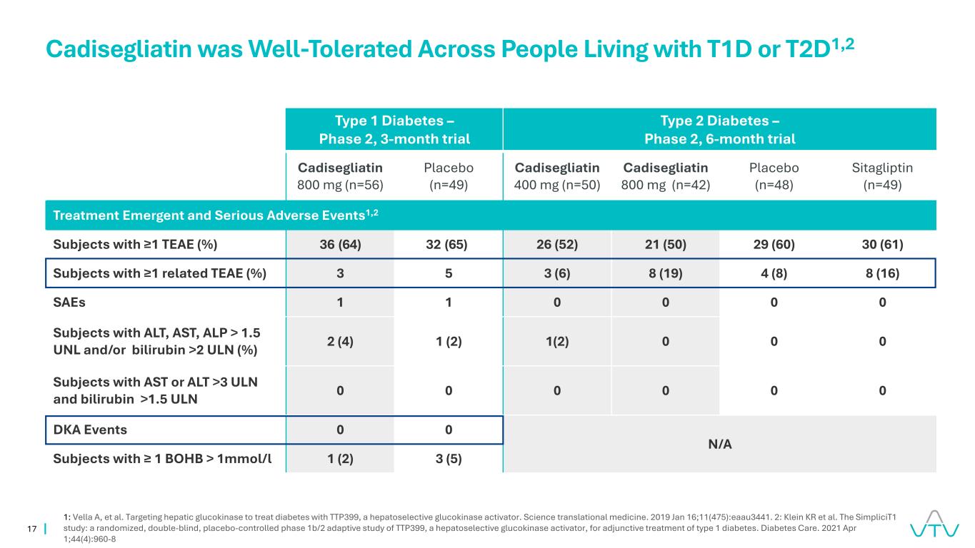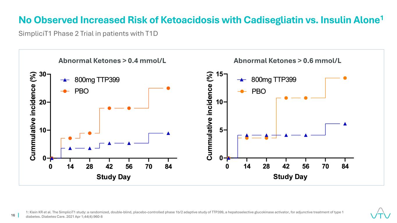 16 Cadisegliatin vs. insulin alone1 simpliciT1 2期试验在T1D异常酮>0.4 mmol/L异常酮>0.6 mmol/L 1患者中未观察到增加的酮酸中毒风险:Klein KR等人。SimpliciT1研究:TTP399(一种肝选择性葡萄糖激酶激活剂)用于1型糖尿病辅助治疗的随机、双盲、安慰剂对照1b/2期适应性研究。糖尿病护理。2021年4月1日;44(4):960-8