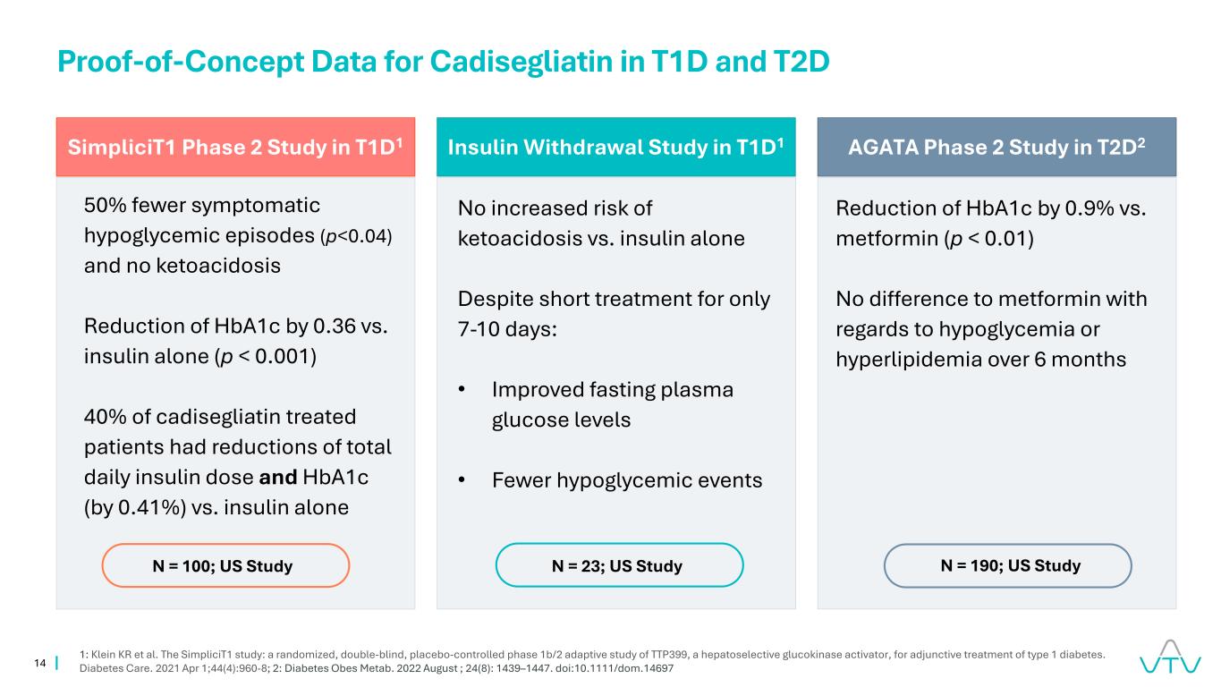 14 T1D1胰岛素戒断研究中的SimpliciT1 2期研究T1D1 AGATA 2期研究T2D2中的酮症酸中毒风险与单独使用胰岛素相比没有增加,尽管治疗时间较短仅为7-10天:•改善空腹血糖水平•更少的低血糖事件减少50%有症状的低血糖发作(p < 0.04)和没有酮症酸中毒HBA1c与单独使用胰岛素相比减少0.36(p < 0.001)40%的cadisegliatin治疗患者每日总胰岛素剂量减少和HBA1c(增加0.41%)vs.单独使用胰岛素降低HBA1c 0.9% vs.二甲双胍(p < 0.01)与二甲双胍在6个月内的低血糖或高脂血症方面没有差异Cadisegliatin在T1D和T2D1中的概念验证数据:Klein KR等人。SimpliciT1研究:TTP399(一种肝选择性葡萄糖激酶激活剂)用于1型糖尿病辅助治疗的随机、双盲、安慰剂对照1b/2期适应性研究。糖尿病护理。2021年4月1日;44(4):960-8;2:糖尿病obes metab。2022年8月;24(8):1439 – 1447. DOI:10.1111/dom.14697 N = 100;美国研究N = 23;美国研究N = 190;美国研究